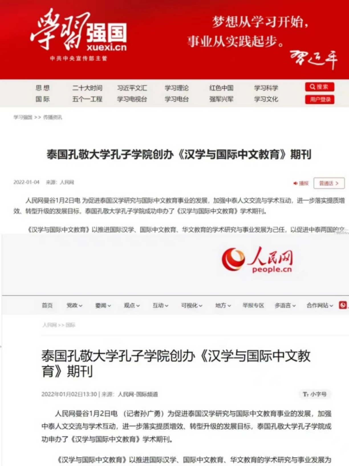 学习强国和人民网对《汉学与国际中文教育》期刊的报道(图源官网截图)