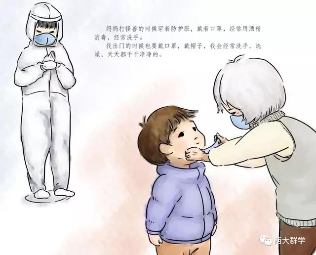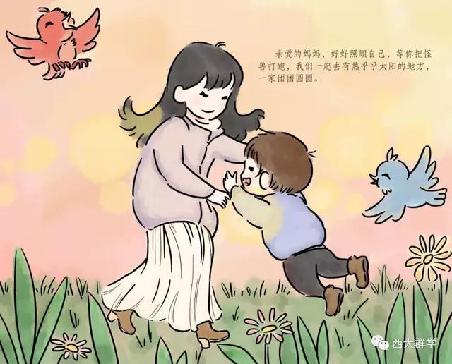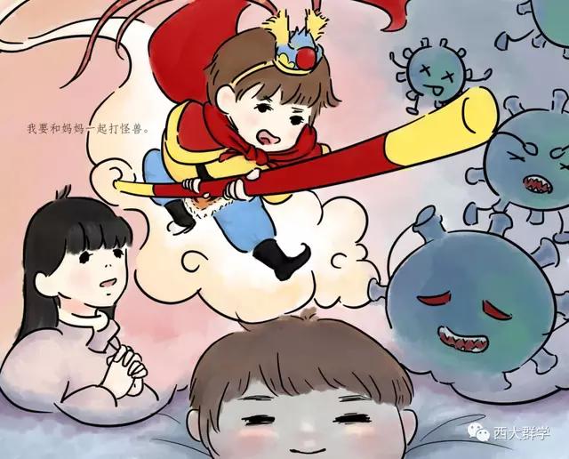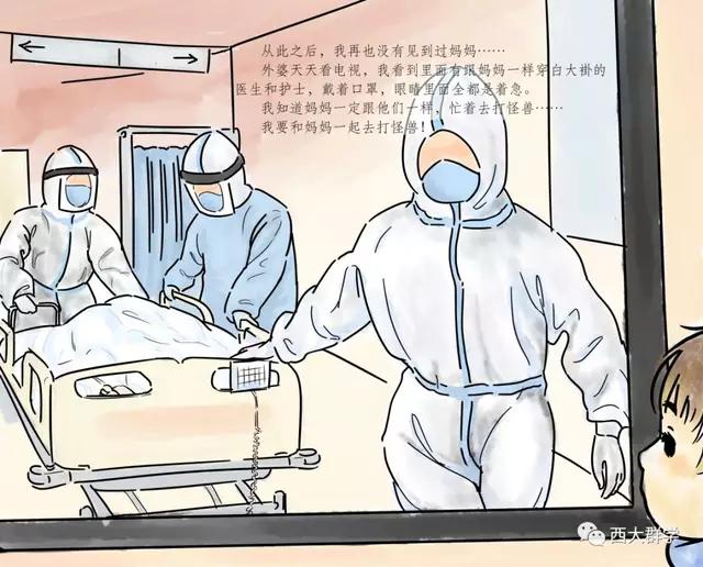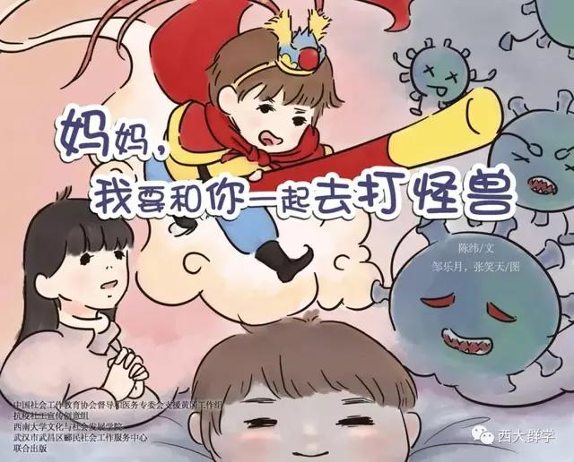 在参加社会工作教育协会督导和医务专委会支援黄冈工作组的工作中,西南大学社会工作系陈纬老师听到了很多医护人员与孩子分离,孩子万般思念父母的故事。有感而发,她专为医护工作者和他们的家庭写了一个故事《妈妈,我要和你一起去打怪兽》,并由文化与社会发展学院2017级学生邹乐月、张笑天为故事配图,做成绘本。绘本展现了在医院工作的妈妈参与抗击新冠肺炎疫情后,孩子元元在家努力和妈妈一起抗击病毒的故事,用生动易懂的语言为孩子解惑,帮助小朋友消除恐惧心理,引导他们看到和理解妈妈的工作,今后也要做打“怪兽”的小英雄。