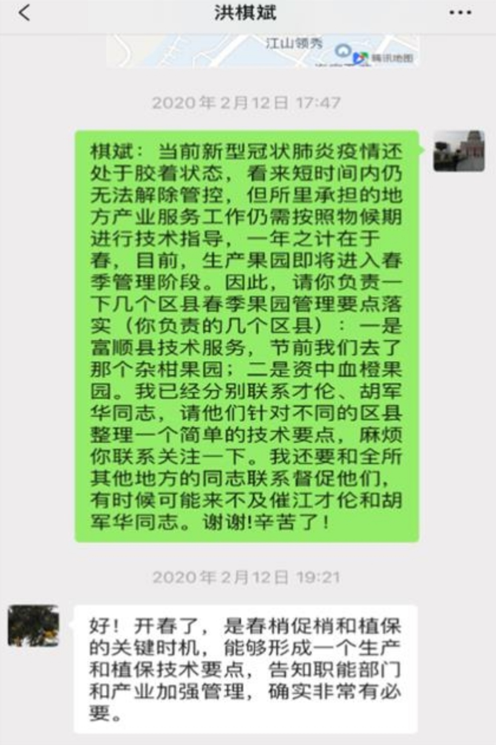 2月初,在四川自贡沿滩区,西南大学柑桔研究所专家江才伦及其技术服务团队通过微信群对果农们进行及时指导。专家们根据当地物候期和果园类别,提供专门的春季管理技术,制定了科学合理的技术管理措施,通过微信群及时指导,加强对果农们的监督,以达到科学问诊。当前,该区3个示范果园已全部按照专家提出的技术措施落实到位。