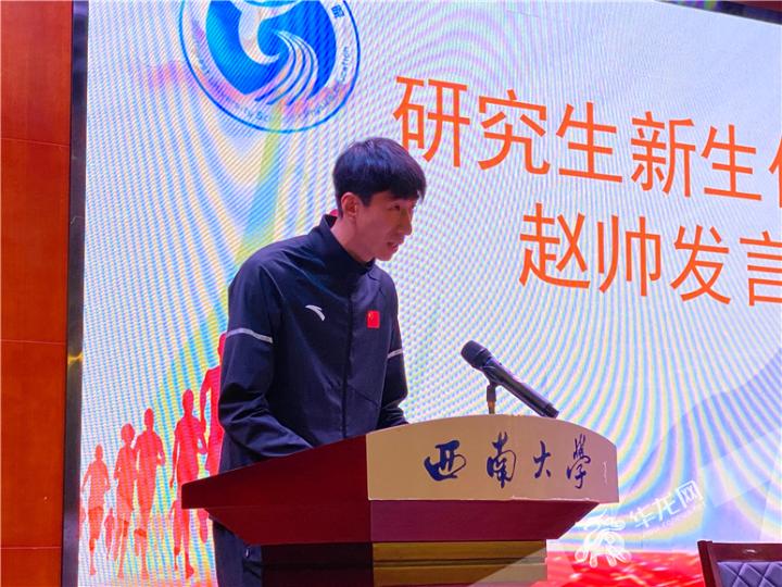 华龙网-新重庆客户端9月21日16时讯(记者秦思思)今(21)日,西南大学举行开学典礼。2016年里约奥运会跆拳道冠军赵帅也将继续在西南大学攻读体育学博士学位。今天,他作为2020级新生代表在西南大学体育学院开学典礼上发言。