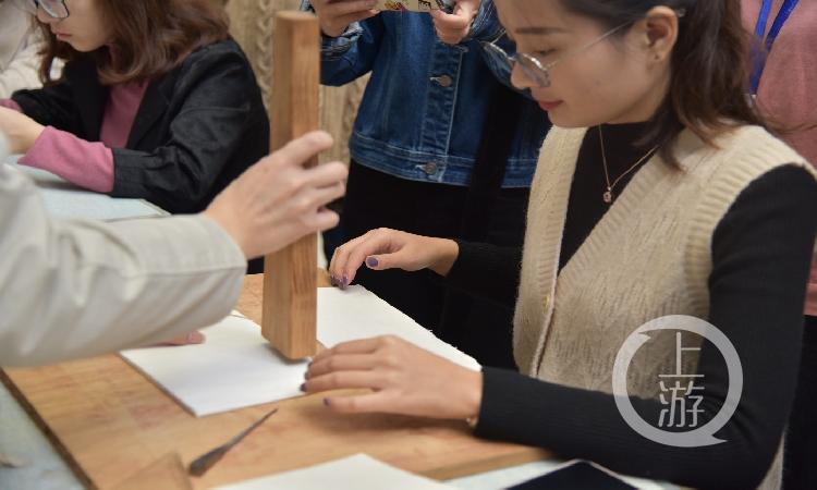西南大学图书馆特殊藏书部主任张慧灵介绍,在场工作人员一个月前便开始接受拓印培训,坚持每天练习一小时,不光是为了活动能顺利举办,取得理想效果,更是为了把传统拓印技艺一代代传承下去,让更多年轻人参与拓印技艺体验活动。她表示,目前众多传统技艺面临着后继无人的困境,让新一代青年人重拾对传统文化及经典技艺的热情,培养他们的参与意识、传承意识。