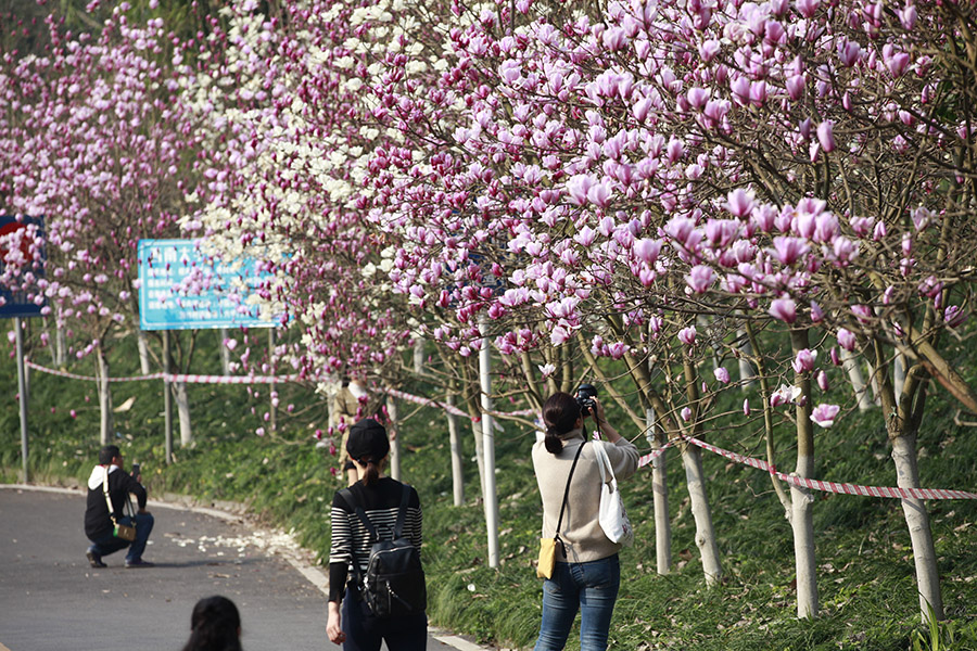 近日,重庆天气晴好,阳光充足,主城繁花似锦。西南大学的花海也不约而同地怒放,特别是玉兰花,红白相间,分外妖娆,引得众多市民前来打卡。(胡虹、袁杰)