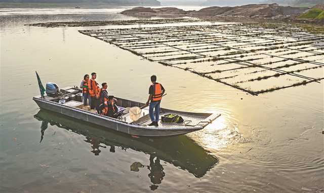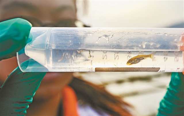 科研人员在人工鱼巢查看鱼类产卵情况。