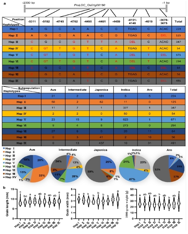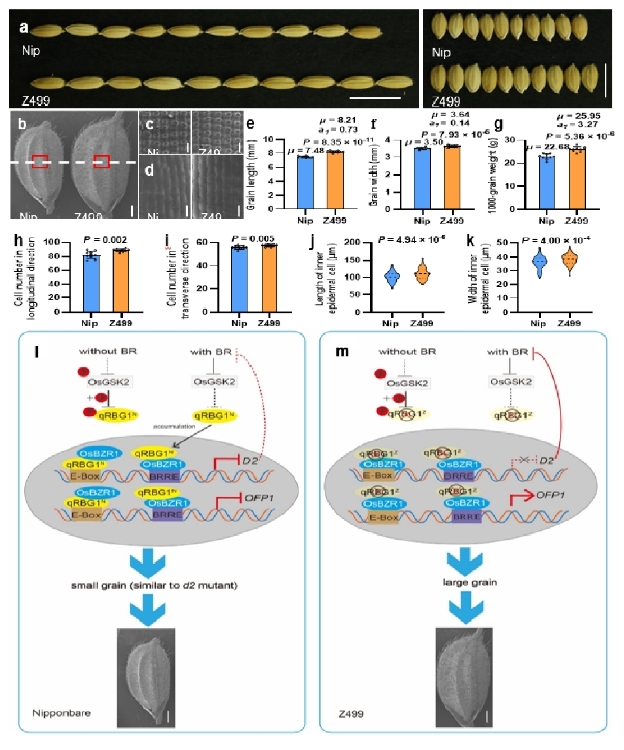 日前,《自然通讯》在线发表了西南大学水稻研究所题为《qRBG1/OsBZR5启动子自然变异引起水稻增产》(Natural variation in the promoter of qRBG1/OsBZR5 underlies enhanced rice yield)的最新研究成果。该研究从单片段代换系(SSSL)构建开始,历时18年。SSSL是集功能基因鉴定和分子设计育种于一体的理想遗传育种材料。研究利用粳型亲籼SSSL-Z499图位克隆1个籼、粳亚种间粒型分化的关键基因qRBG1/OsBZR5。该基因通过同时影响细胞扩张和细胞分裂调控水稻籽粒大小。 在日本晴背景中含有来自籼型恢复系西恢18的稀有等位变异基因qRBG1Z的单片段代换系Z499 表现长、宽大粒;与日本晴相同的Hap I粳稻品种呈现典型的短、宽粒;与qRBG1Z序列接近的Hap V、Hap VI 和Hap Ⅳ等籼型品种呈现典型的细长粒(图1)。