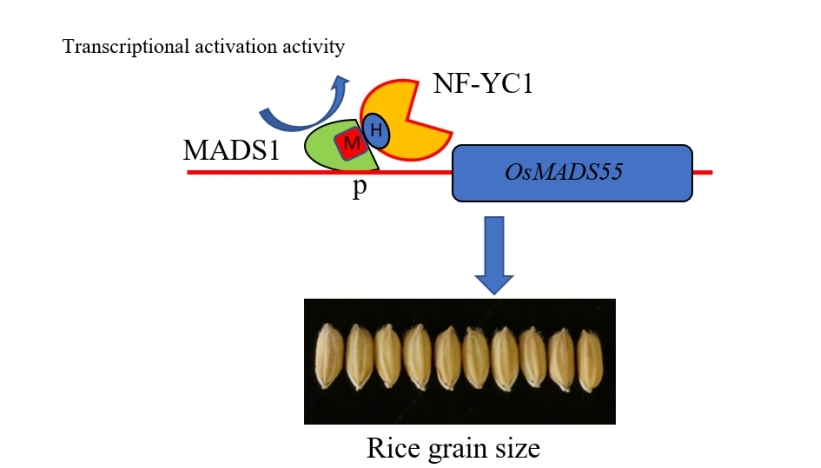 前期,《植物杂志》在线发表了题为《转录因子OsNF-YC1通过协同转录激活OsMADS1转录因子调控水稻籽粒大小》(Transcription factor OsNF-YC1 regulates grain size by coordinating the transcriptional activation of OsMADS1 in Oryza sativa L.)的研究论文,解析了OsNF-YC1-OsMADS1-OsMADS55通路在水稻粒宽发育中的分子调控机理(图3)。OsNF-YC1敲除突变体籽粒变窄、千粒重降低,但穗粒数增多,从而保持单株产量不变,这为利用生物育种手段协同改良水稻产量和品质提供了基因资源和育种策略。西南大学为论文署名单位,硕士研究生崔志波、高级实验师王晓雯为共同第一作者,桑贤春教授为通讯作者。研究得到了国家自然科学基金、重庆市现代农业产业技术体系创新团队、重庆市自然科学基金创新群体和西南大学青年团队专项基金的资助。