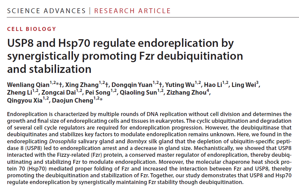 3月19日,前沿交叉学科研究院生物学研究中心程道军教授课题组在《科学进展》(Science Advances)发表了题为《USP8和Hsp70通过协同促进Fzr蛋白的去泛素化及稳定性来调控核内复制》(USP8 and Hsp70 regulate endoreplication by synergistically promoting Fzr deubiquitination and stabilization)的研究论文。该研究以家蚕丝腺和果蝇唾液腺为模式,发现去泛素化酶USP8与分子伴侣Hsp70协同维持核内复制细胞周期关键调控因子Fzr的蛋白稳定性,进而控制核内复制进程和器官大小。