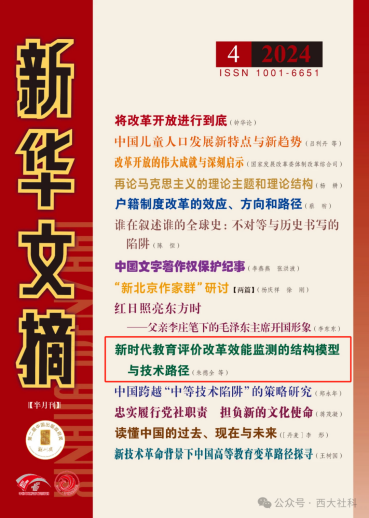 近期,朱德全教授及其团队撰写的论文《新时代教育评价改革效能监测的结构模型与技术路径》被《新华文摘》2024年第4期全文转载,并入选封面文章(原文刊发在《西南大学学报(社会科学版)》2023年第6期)。该成果是朱德全教授主持的2022年度教育部哲学社会科学研究重大课题攻关项目《新时代教育评价改革的实现路径研究》(22JZD046)的阶段性核心成果。