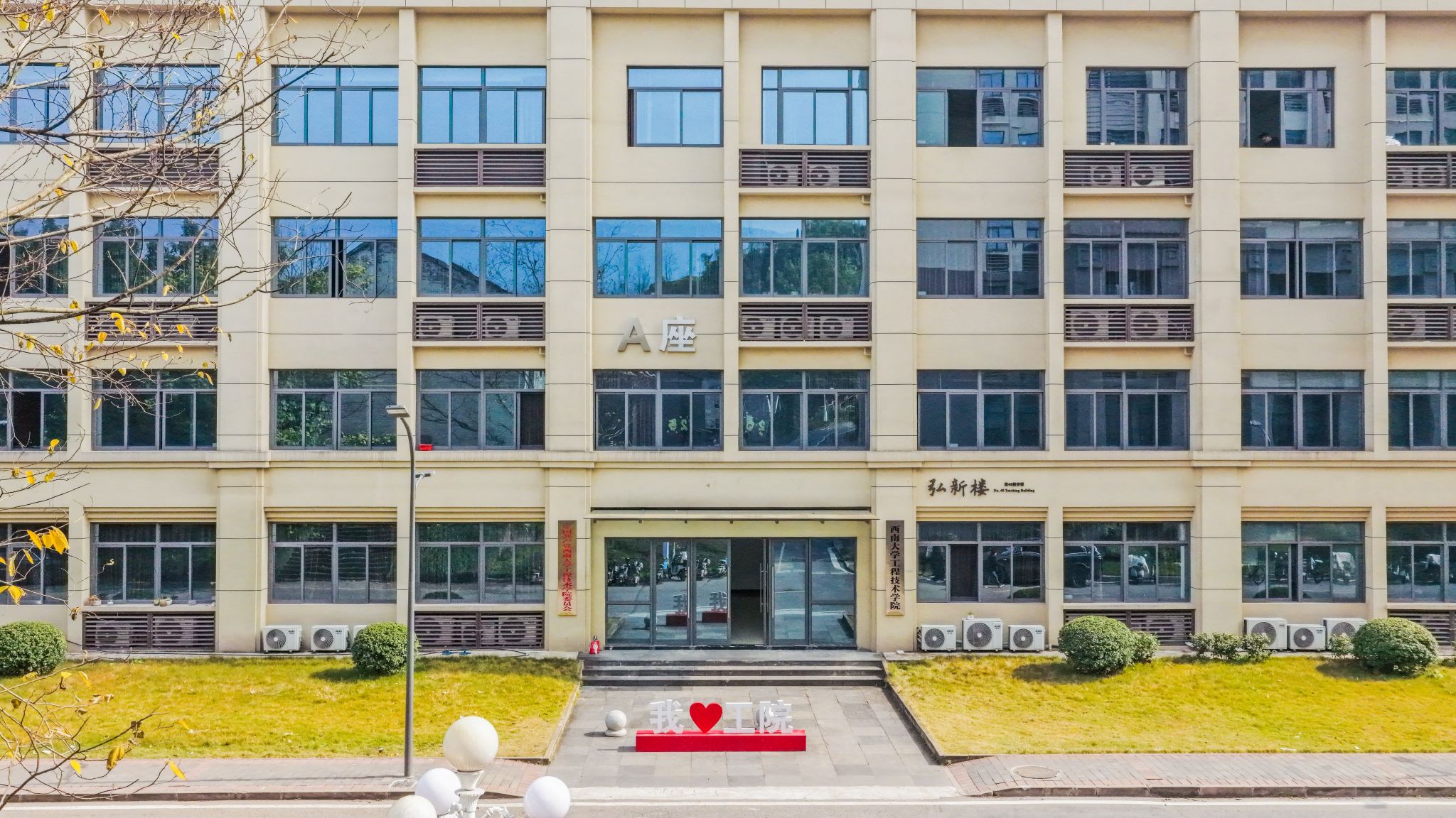 “弘新楼”,寓意弘扬科学家精神之“勇攀高峰、敢为人先的创新精神”。本楼落成于2021年,建筑面积31491㎡,现为工程技术学院使用。