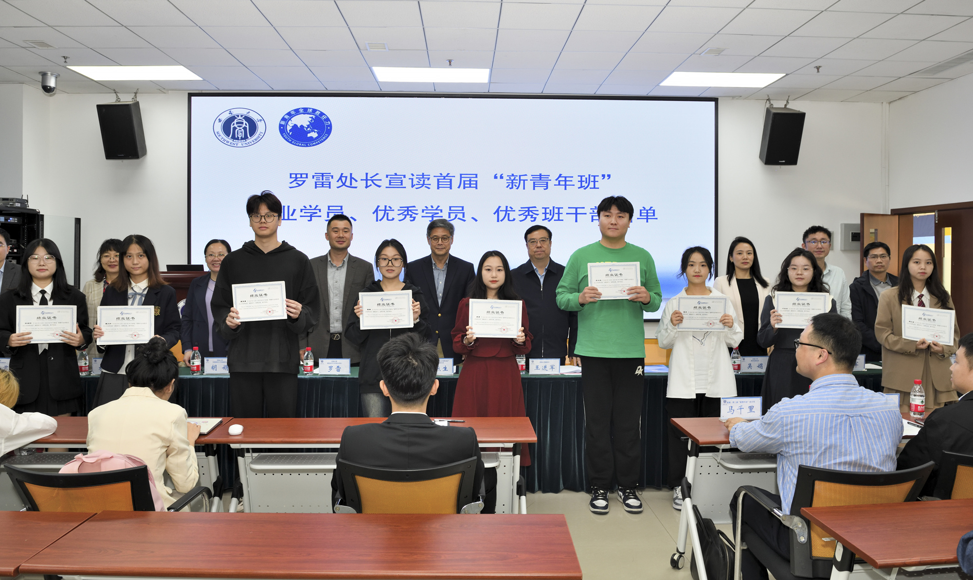 国际合作与交流处处长罗雷宣读新青年班首届结业学员、优秀学员和优秀班干部名单,第二届新青年班入选学院名单。与会领导为结业学员颁发结业证书,为优秀学员、优秀班干部颁发荣誉证书,为新聘学业导师颁发聘书。首届新青年班优秀学员代表李伊苡同学、第二届新青年班学员代表贾海畅同学发言。国家治理学院教师郭美云在发言中回顾了一年来学院新青年班人才培养工作,希望学员们踔厉奋发、追求卓越,各单位协同助力西大培育出更多国家栋梁之材。