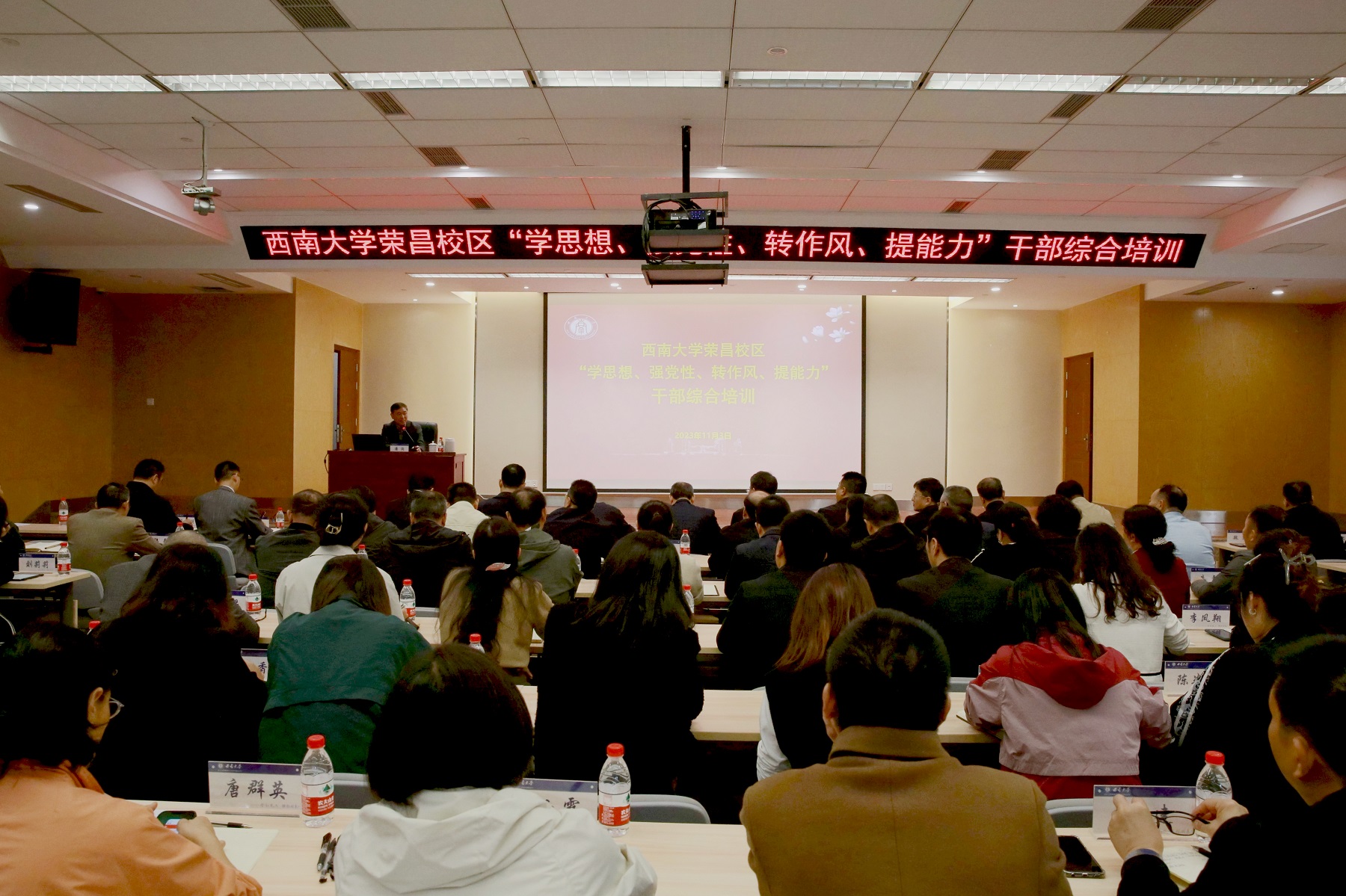 11月3日,学校党委副书记潘洵带领学校党政办公室、党委组织部、党委统战部等职能部门相关负责同志赴荣昌校区调研校区干部队伍建设工作,为荣昌校区“学思想 强党性 转作风 强能力”干部综合培训班作专题辅导报告。
