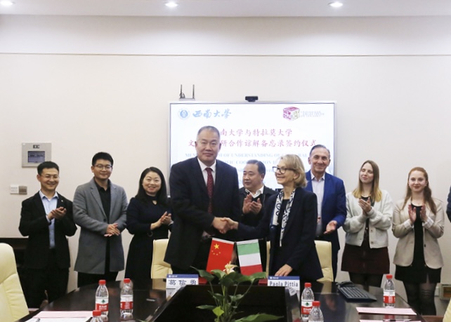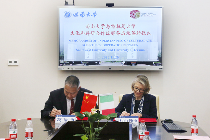 近期,意大利特拉莫大学代表团访问中国西南地区,开展了一系列科技与文化交流活动。11月26日,学校与特拉莫大学代表团正式签署关于文化和科研合作谅解备忘录。特拉莫大学副校长宝拉(Paola)和安东尼罗(Antonello)教授,西南大学副校长葛信勇出席签约仪式,国际合作处、涪陵研究院、食品科学学院,四川农业大学食品学院有关领导、专家及学生代表参加仪式。根据合作谅解备忘录,双方将加强人员交流和科研合作,共同建立植物与菌类资源创新利用国际联合实验室。