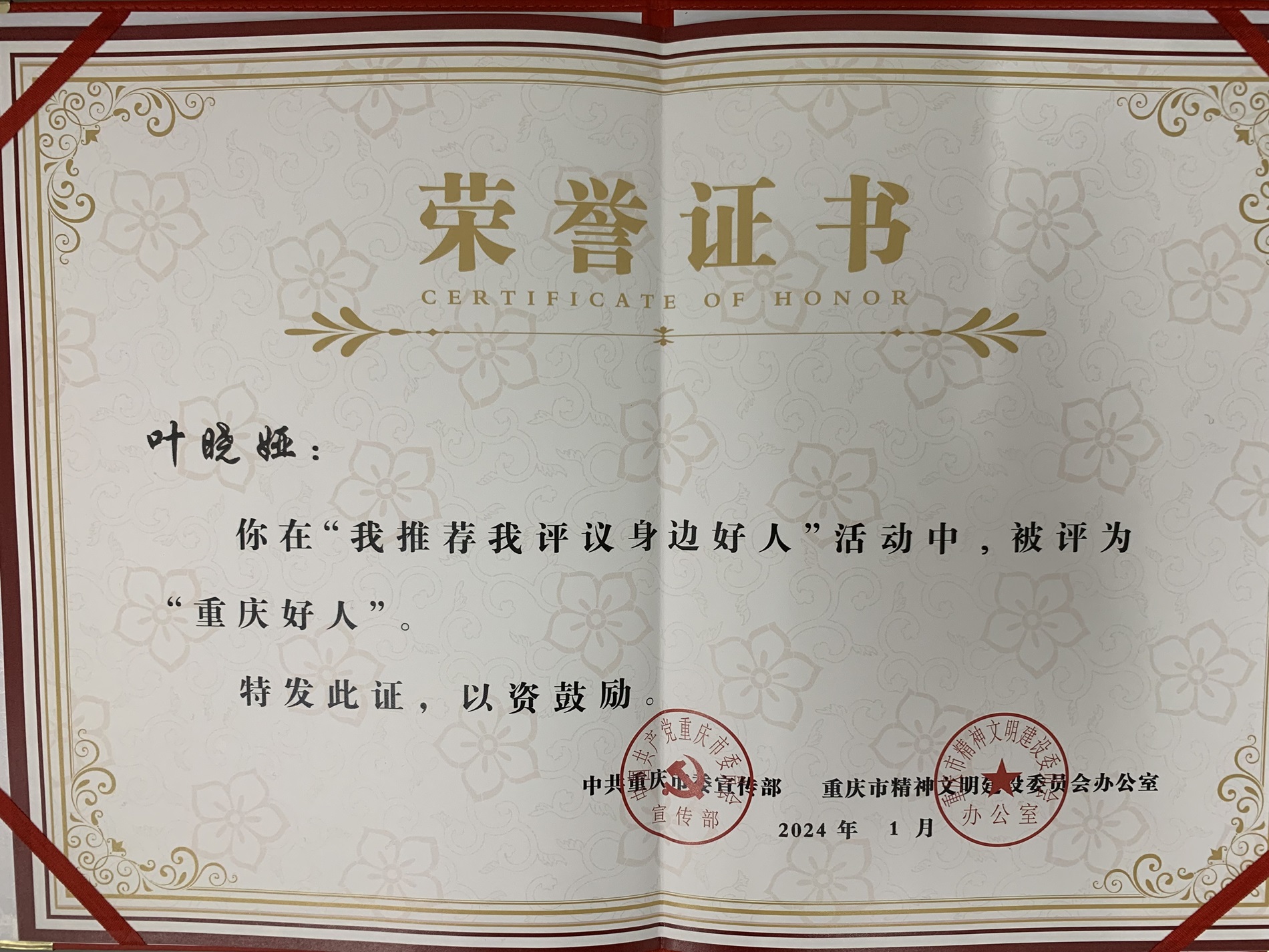 据悉,2023年第四季度“重庆好人榜”由全市32万名网民的推荐、点赞和评论推选产生,叶晓娅以其助人为乐精神的持续性、深入性在91名候选人中脱颖而出,最终获评“重庆好人”。