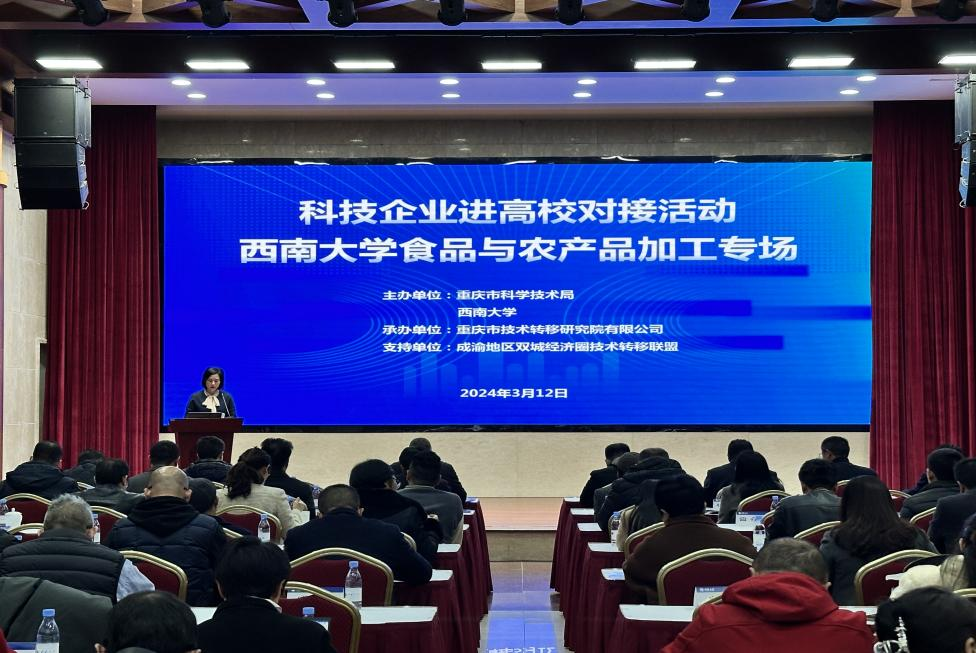3月12日,学校联合重庆市科学技术局举办了科技企业进高校科技成果对接活动——西南大学食品与农产品加工专场。学校副校长葛信勇、重庆市科学技术局成果转化与创新创业处处长熊新出席对接会。学校科学技术处、国内合作处、科学中心(大学科技园管理中心、产业技术研究院)、相关二级单位,重庆市技术转移研究院有限公司等单位相关负责人,16家相关企业负责人及其代表30余人和学校相关领域科研团队代表50余人参会。
