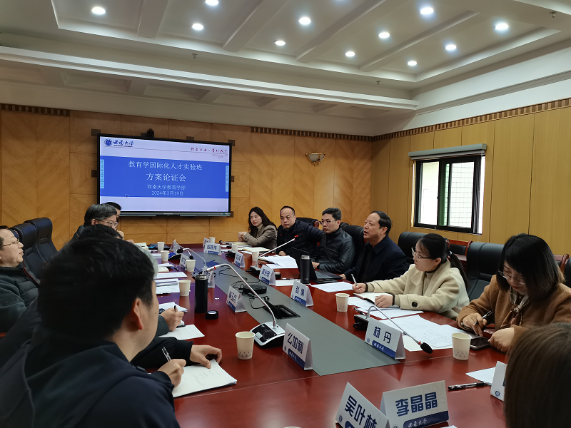 为加大培养教育学领域拔尖创新人才,推进西南大学本科人才培养多样化发展,3月19日上午,学校在田家炳教育书院801会议室召开了“教育学国际化人才实验班”方案论证会。学校副校长周光明出席会议,发展规划与学科建设部、教务处、研究生院、国际合作与交流处、财务部等部门相关人员及教育学部有关负责人等出席论会议,会议由教育学部党委书记周文全主持。