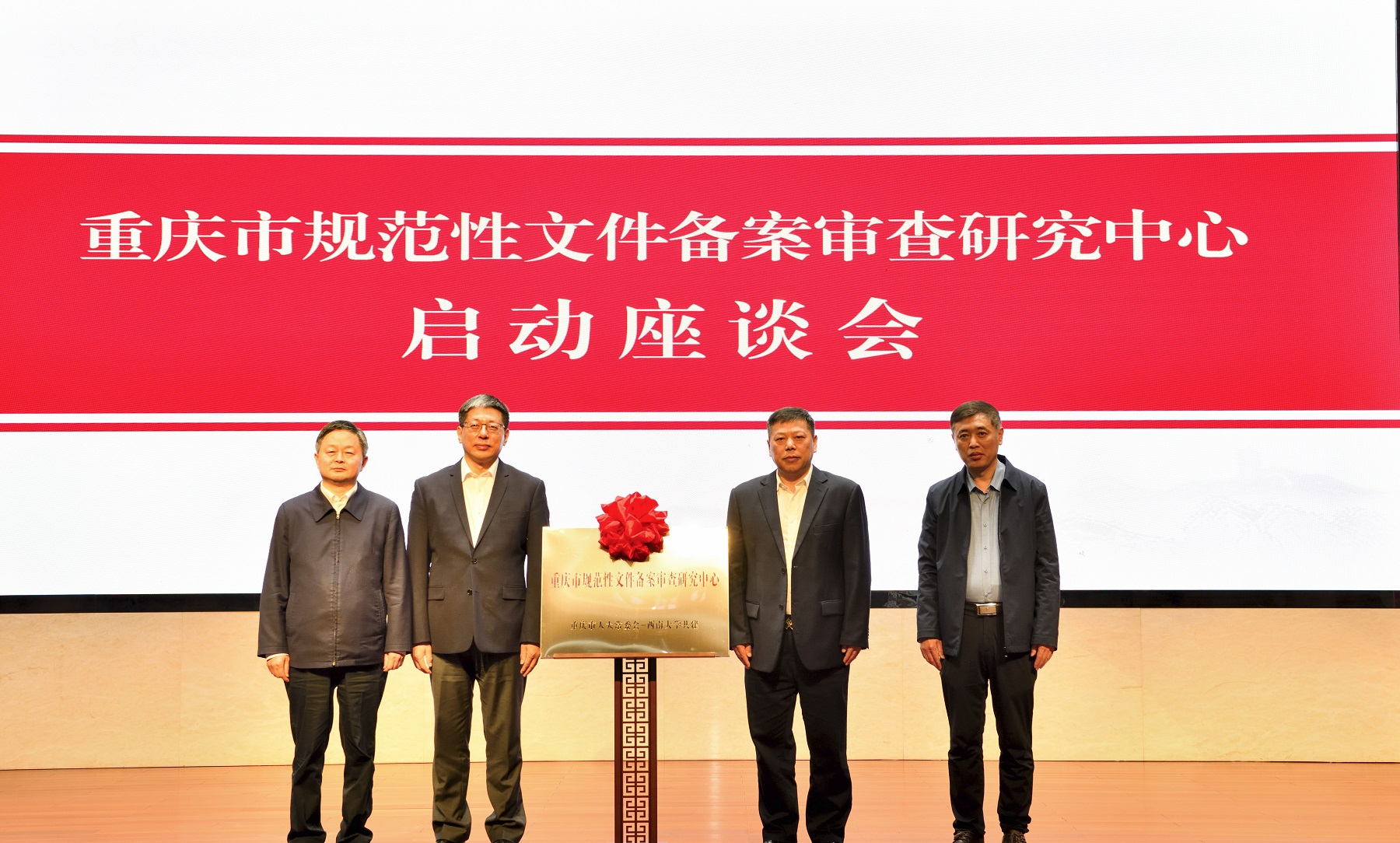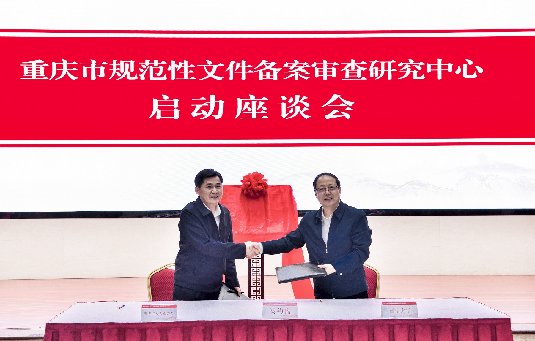 会议通报《重庆市规范性文件备案审查研究中心建设方案》。市人大常委会副秘书长邓炳国与西南大学副校长周光明签订研究中心共建协议。全国人大常委会法工委副主任张勇、市人大常委会副主任欧顺清、西南大学校长张卫国、西南大学党委副书记潘洵为中心揭牌。