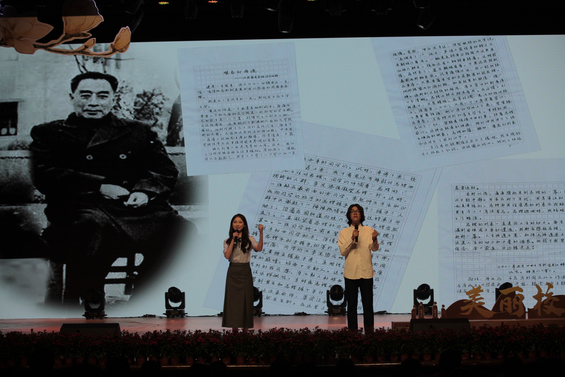 晚会现场,大屏幕上展示了一封手写书信。这是不久前西南大学1957级老校友寄来的。信里说,1958年的阳春三月,他和同学们正在大校门种树,不经意间,看到了周恩来总理。伴随着讲解员深情地讲述,一幕动人的往事展示在眼前,不少观众眼角闪动着泪光。