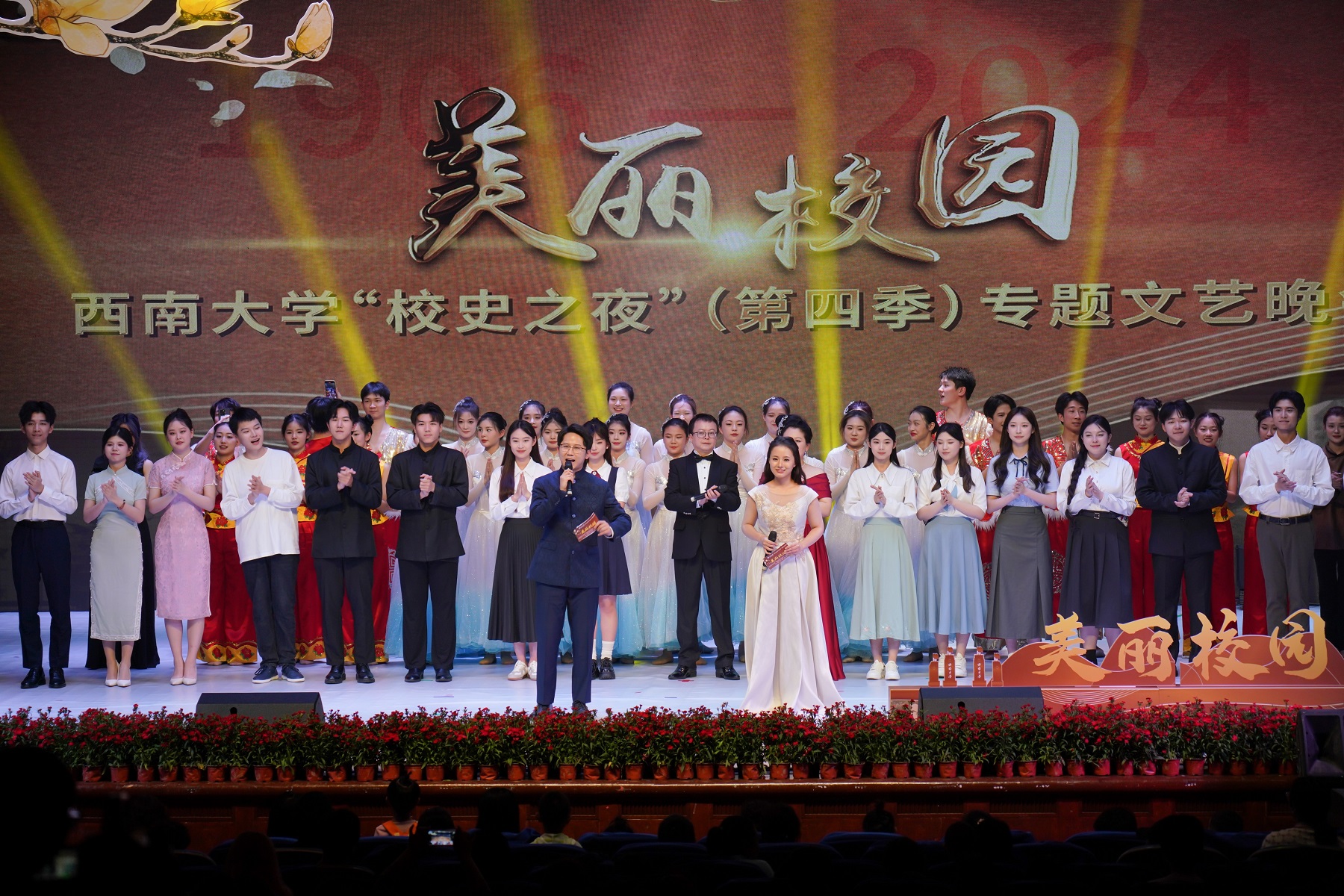晚会中,学生们还诵读了歌颂校花玉兰的《玉兰赋》选段,幼儿园的小朋友还带来了舞蹈《可爱的蓝花楹》,音乐学院师生们配合情景讲述,带来了歌舞《嘉陵江上好风光》《太阳出来喜洋洋》《多情的土地》《我的深情为你守候》等节目,向观众们展示了西南大学校园文化建设的新成就和在助力乡村振兴的实践中所创造的“美丽风景”。