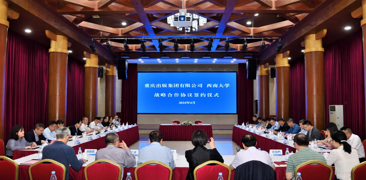 4月29日,“重庆出版集团有限公司 西南大学战略合作协议签约仪式”在东方红会议厅举行。重庆出版集团有限公司党委书记、董事长、总经理李斌,副总经理邱振邦,学校党委书记张卫国、党委副书记潘洵,高等学校出版专业教学指导委员会副主任委员兼秘书长、北京印刷学院原副校长王关义,市委宣传部出版处处长蒲洋出席仪式。重庆出版集团、学校有关部门负责人,专家学者代表参会。仪式由新闻传媒学院院长龙伟主持。