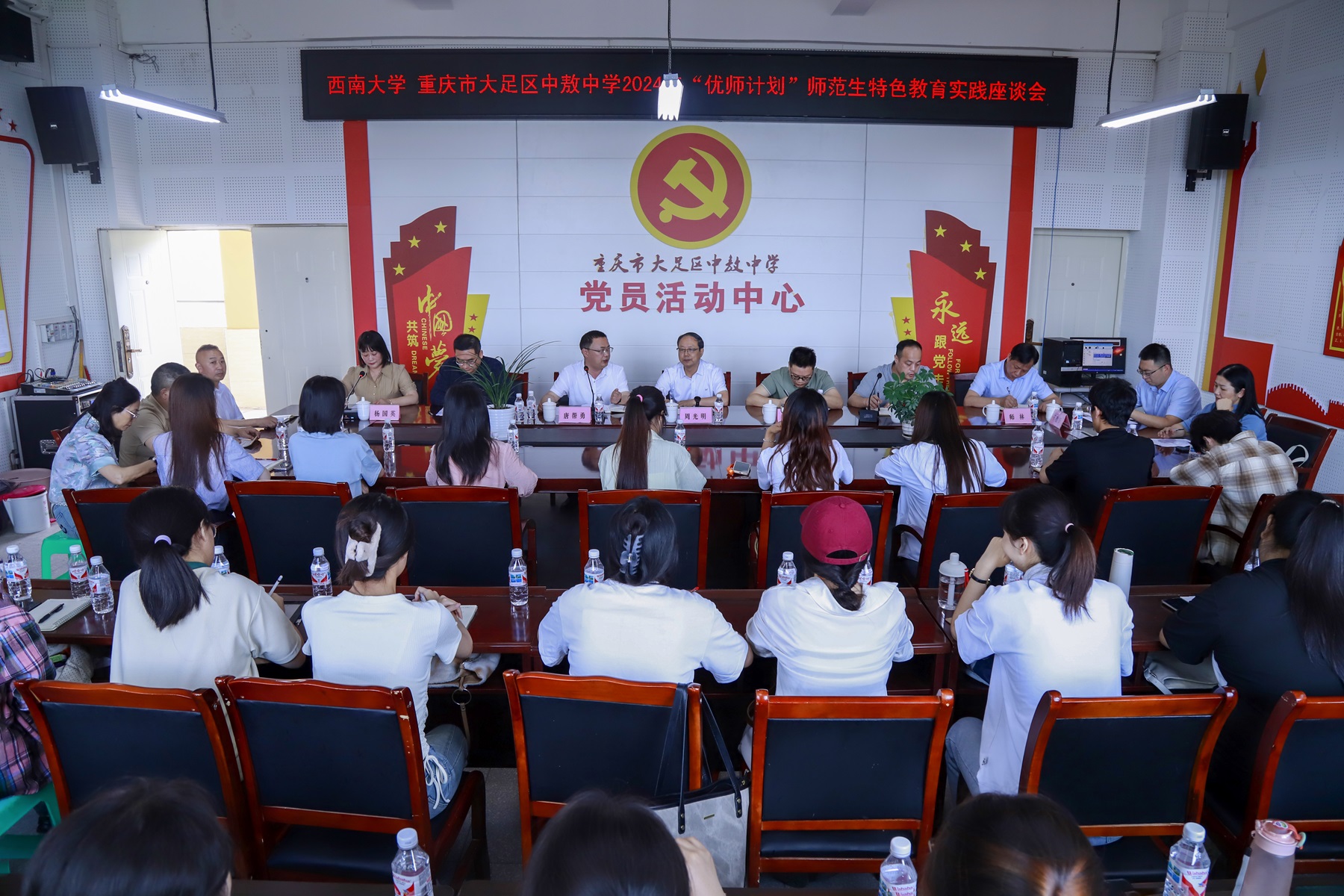 座谈会上,区校双方分别就大足区基础教育基本情况、中敖中学办学情况以及西南大学服务地方基础教育工作情况作了介绍,同时听取了双方实习指导教师代表、实习队工作汇报。交流环节,实习生们踊跃发言,为大足区基础教育高质量发展积极建言献策。