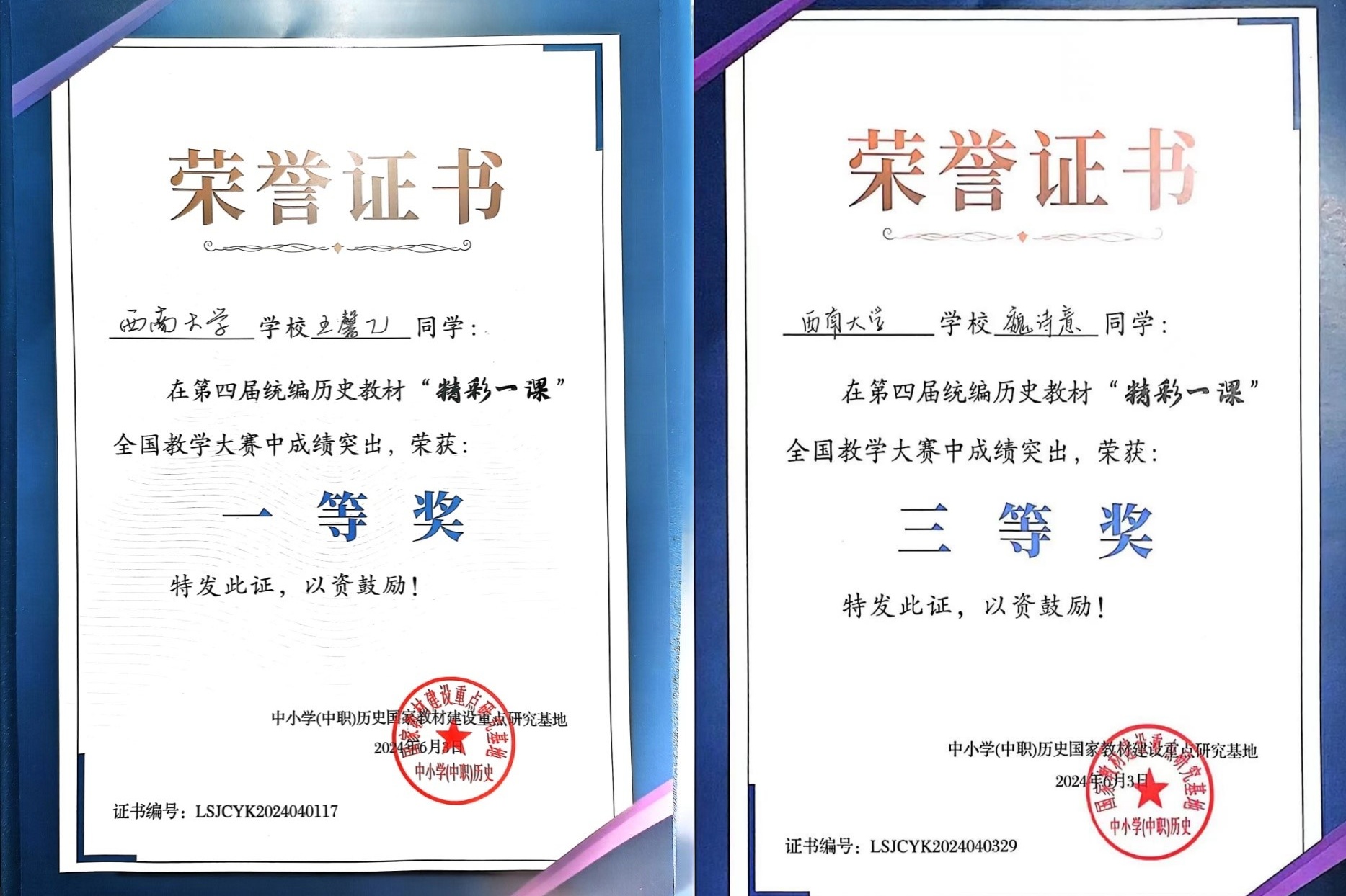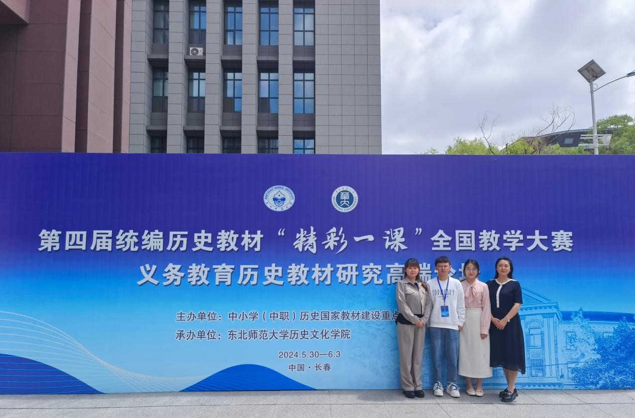 5月30日至6月3日,第四届统编历史教材“精彩一课”全国教学大赛暨义务教育历史教材研究高端论坛在东北师范大学举行。本次大赛由中小学(中职)历史国家教材建设重点研究基地主办,东北师范大学历史文化学院承办,共有来自北京师范大学、华东师范大学、西南大学等70余所高校的150名同学参赛。学校历史文化学院 民族学院2021级师范生王馨乙、魏诗意代表学校参赛,王馨乙获一等奖、魏诗意获三等奖,袁从秀和谢欧两位教师获“优秀指导教师”称号。