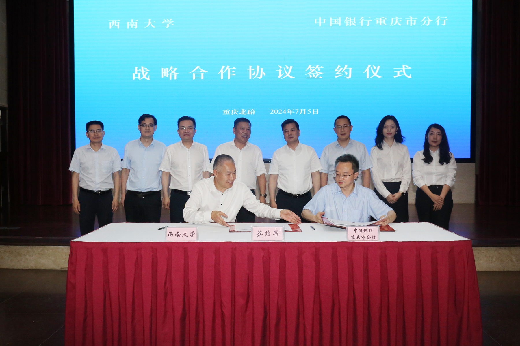 7月5日,西南大学与中国银行重庆市分行战略合作协议签约仪式暨交流座谈会在学校举行。中国银行重庆市分行行长、党委书记吴奇志,副行长、党委委员吴涛,学校党委书记张卫国,副校长葛信勇出席签约仪式。仪式由葛信勇主持,双方在会上签署了合作框架协议。