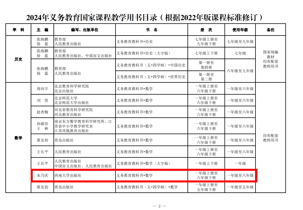 近日,教育部办公厅印发《2024年义务教育国家课程教学用书目录(根据2022年版课程标准修订)》,学校出版社出版的《数学》(1-6年级)、《艺术·音乐》(1-6年级)、《艺术·音乐》(7-9年级)、《艺术·戏剧(戏曲)》(8-9年级)、《艺术·影视(含数字媒体艺术)》(8-9年级)、《艺术·舞蹈》(8-9年级)等6种42册教材均通过教育部审核,被列入该目录。