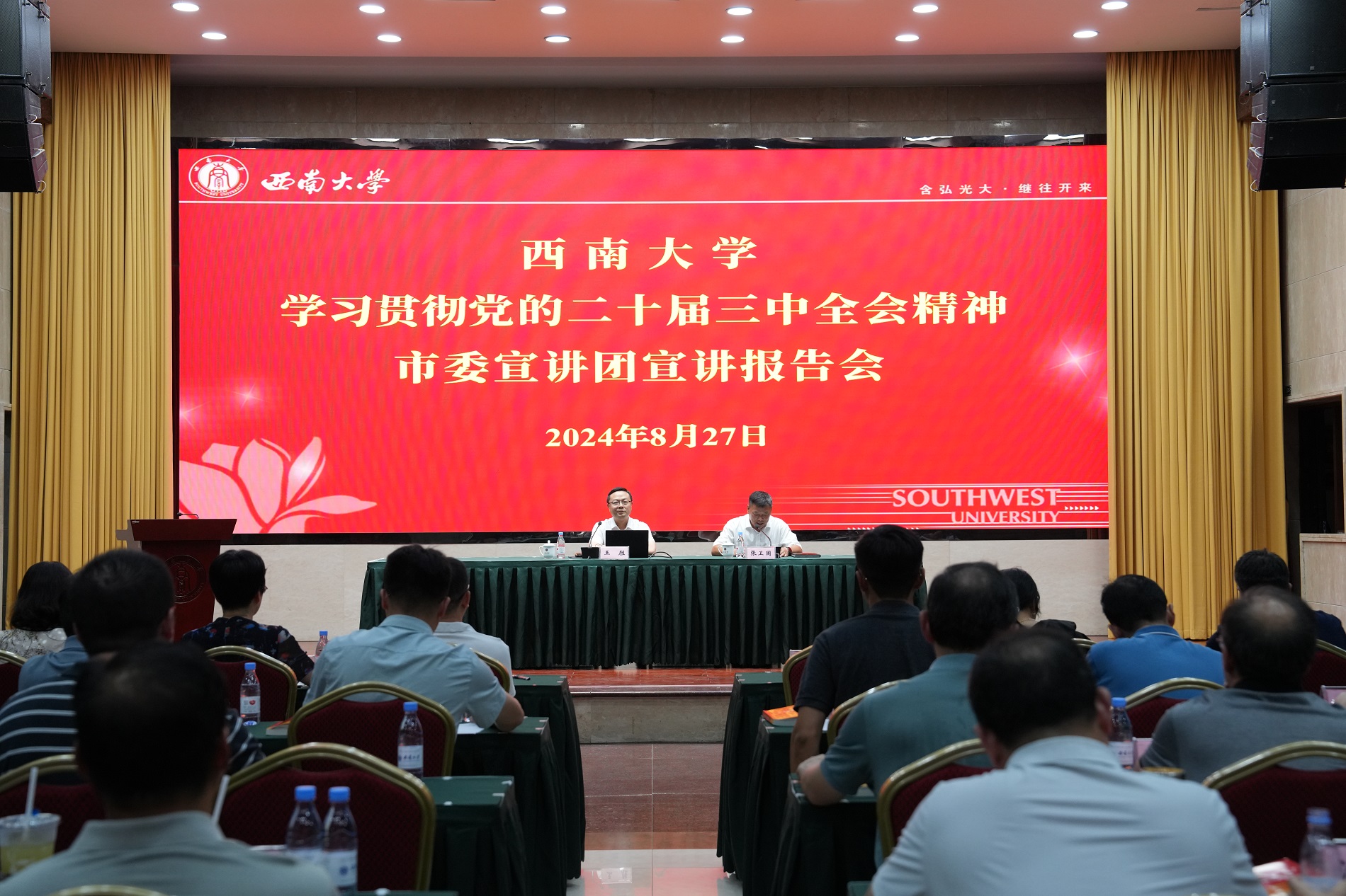 根据市委统一安排,市委宣讲团成员、重庆市委党校(重庆行政学院)副校(院)长王胜作宣讲报告。报告会上,王胜回顾梳理了党的历届三中全会,强调此次全会是在以中国式现代化全面推进强国建设、民族复兴伟业的关键时期召开的一次十分重要的会议。报告阐述了全会的基本情况,深入解读了习近平总书记在党的二十届三中全会上的重要讲话精神和《决定》提出的关于进一步全面深化改革的重大举措,强调要贯通学习习近平总书记对重庆改革工作的系列重要指示要求,加快打造全面深化改革先行区,全力以赴抓好全会精神贯彻落实,为奋力谱写中国式现代化重庆篇章作出新的更大贡献。