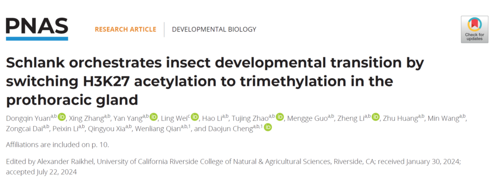 近日,西南大学前沿交叉学科研究院生物学研究中心程道军教授课题组在国际知名期刊《美国科学院院刊》(PNAS)在线发表了题为“转录因子Schlank通过介导前胸腺中H3K27乙酰化向甲基化修饰的转变调控昆虫变态发育”(Schlank orchestrates insect developmental transition by switching H3K27 acetylation to trimethylation in the prothoracic gland)的研究论文。该研究以家蚕和果蝇为模式,发现转录因子Schlank介导幼虫末龄阶段前胸腺细胞中发生组蛋白H3K27乙酰化修饰(H3K27ac)向三甲基化修饰(H3K27me3)转变,进而抑制保幼激素信号转导分子Hairy的转录,最终促进蜕皮激素合成与变态发育。该研究系统解析了H3K27修饰模式的变化调控昆虫发育转变的表观遗传机制。