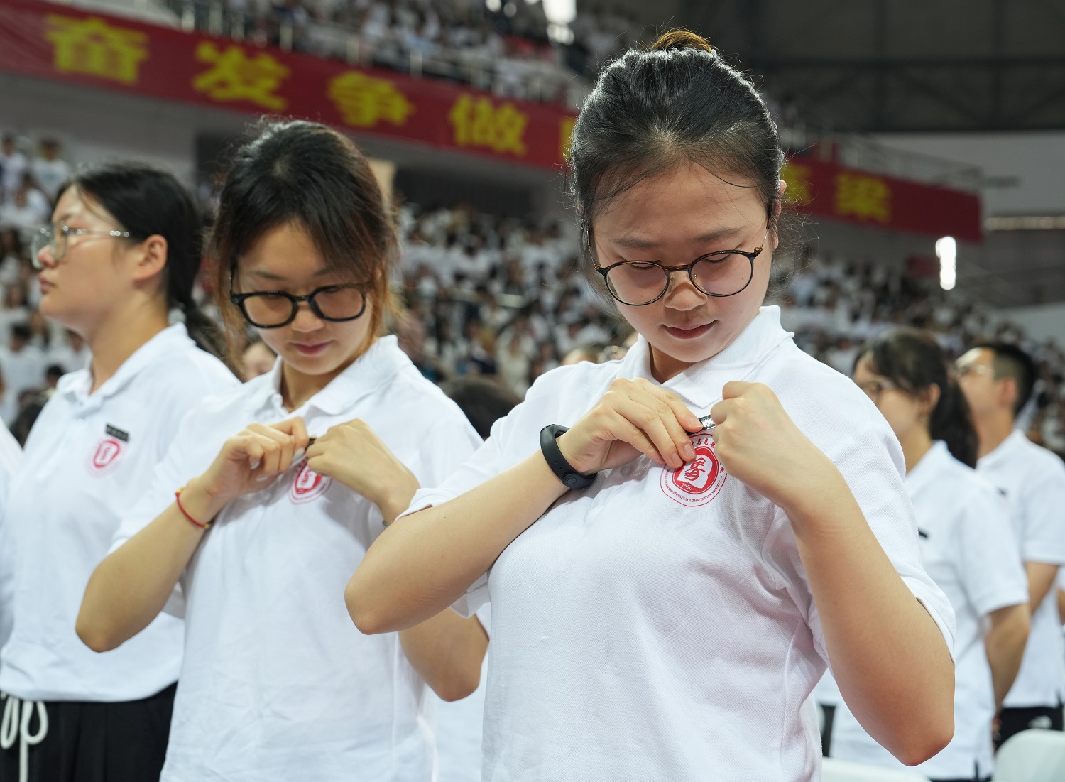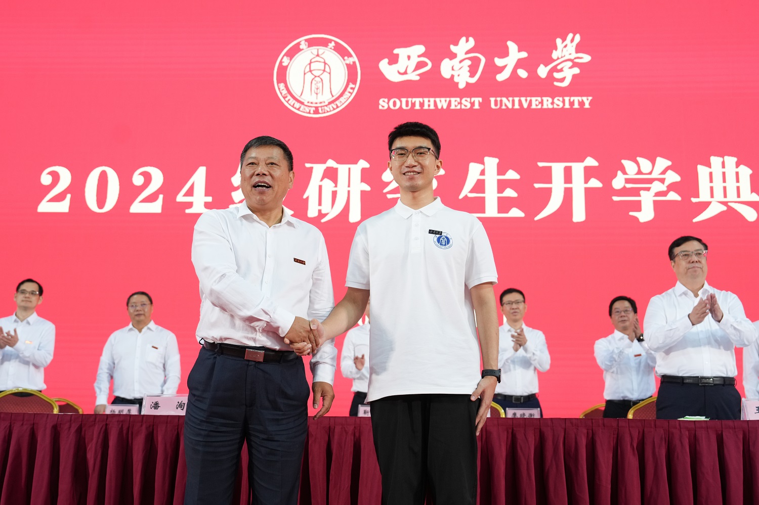典礼还举行了佩戴校徽仪式。党委书记张卫国为新生代表佩戴西南大学徽章。希望2024级全体研究生秉承“含弘光大、继往开来”的校训和“特立西南、学行天下”的大学精神,薪火相传、不懈奋斗,续写属于新一代西大人的崭新篇章。