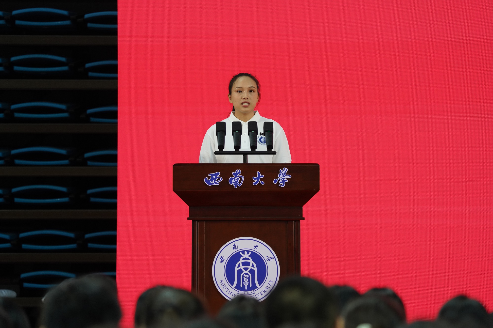 水产学院2022级渔业发展专业硕士研究生陈玥瑚代表高年级研究生发言。她从自身科研经历出发,结合在西南大学的学习收获,鼓励新同学们以所学、所研、所育反哺于社会,服务于民生,融世界发展潮流,主动投身中国式现代化建设的火热实践,发出“强国有我”最强音。