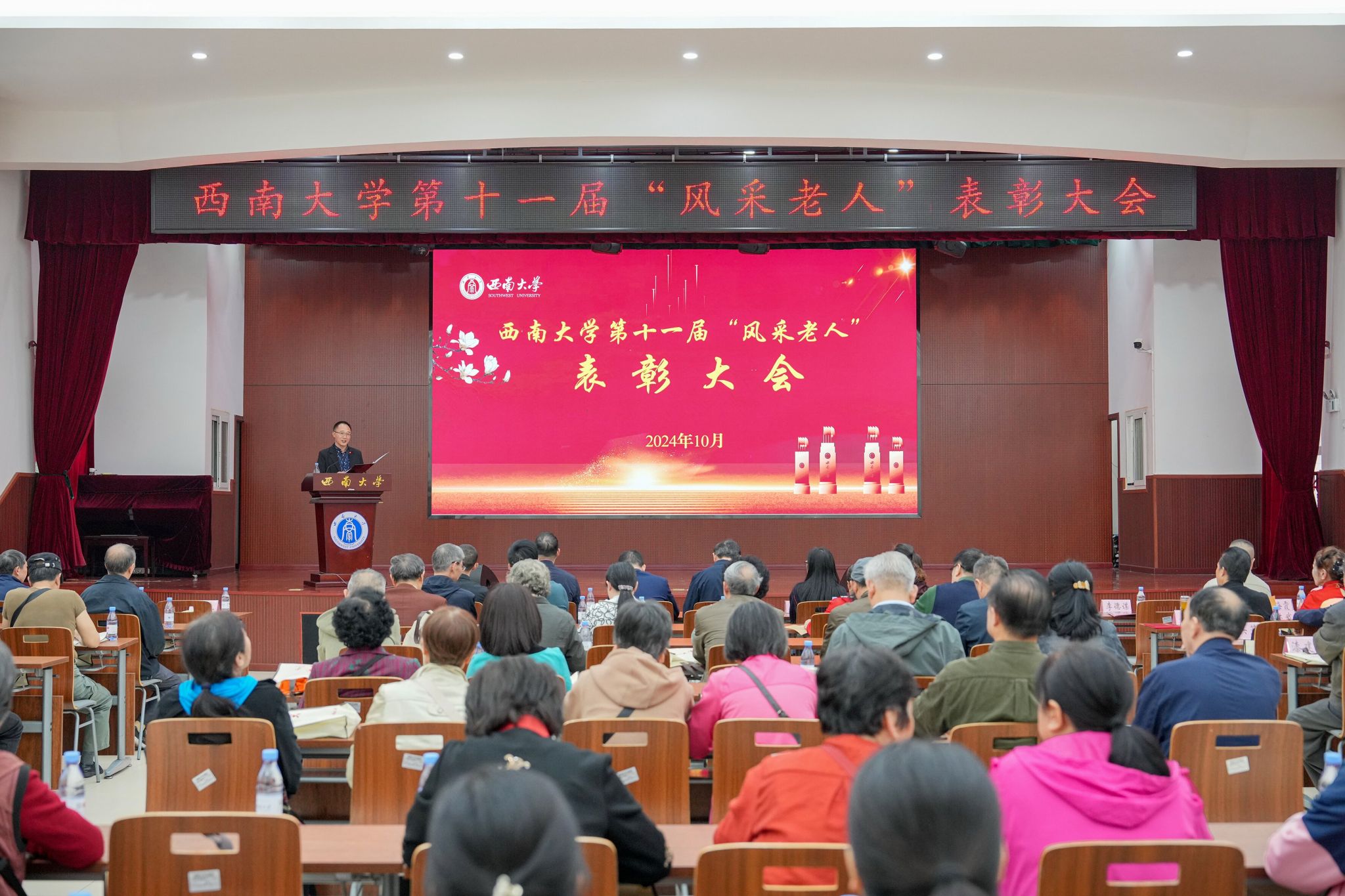10月9日,学校举行第十一届“风采老人”表彰大会,党委副书记潘洵出席并讲话。党政办公室,党委组织部,人力资源部,离退休党委、离退休工作处等单位负责人,以及受表彰老同志、离退休教职工代表共计100余人参会。会议由离退休工作处处长鲁森主持。