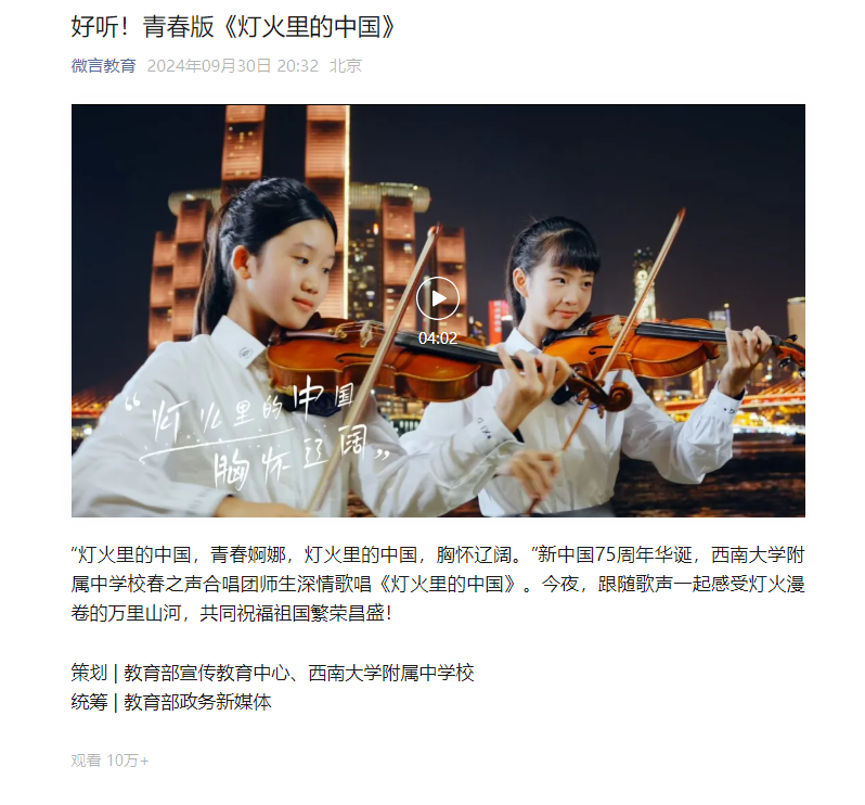 近日,附属中学师生以歌声献礼国庆,深情演唱《灯火里的中国》,被教育部官方微信公众号“微言教育”关注报道,推文累计阅读量逾10万。附属中学此次推出的青春版《灯火里的中国》视频由附属中学春之声合唱团编排,师生们在学校教室、操场、图书馆等多个场景真情歌唱,表达对祖国的深沉热爱和真挚祝福,尽显附中学子昂扬向上、奋发图强的精神面貌。