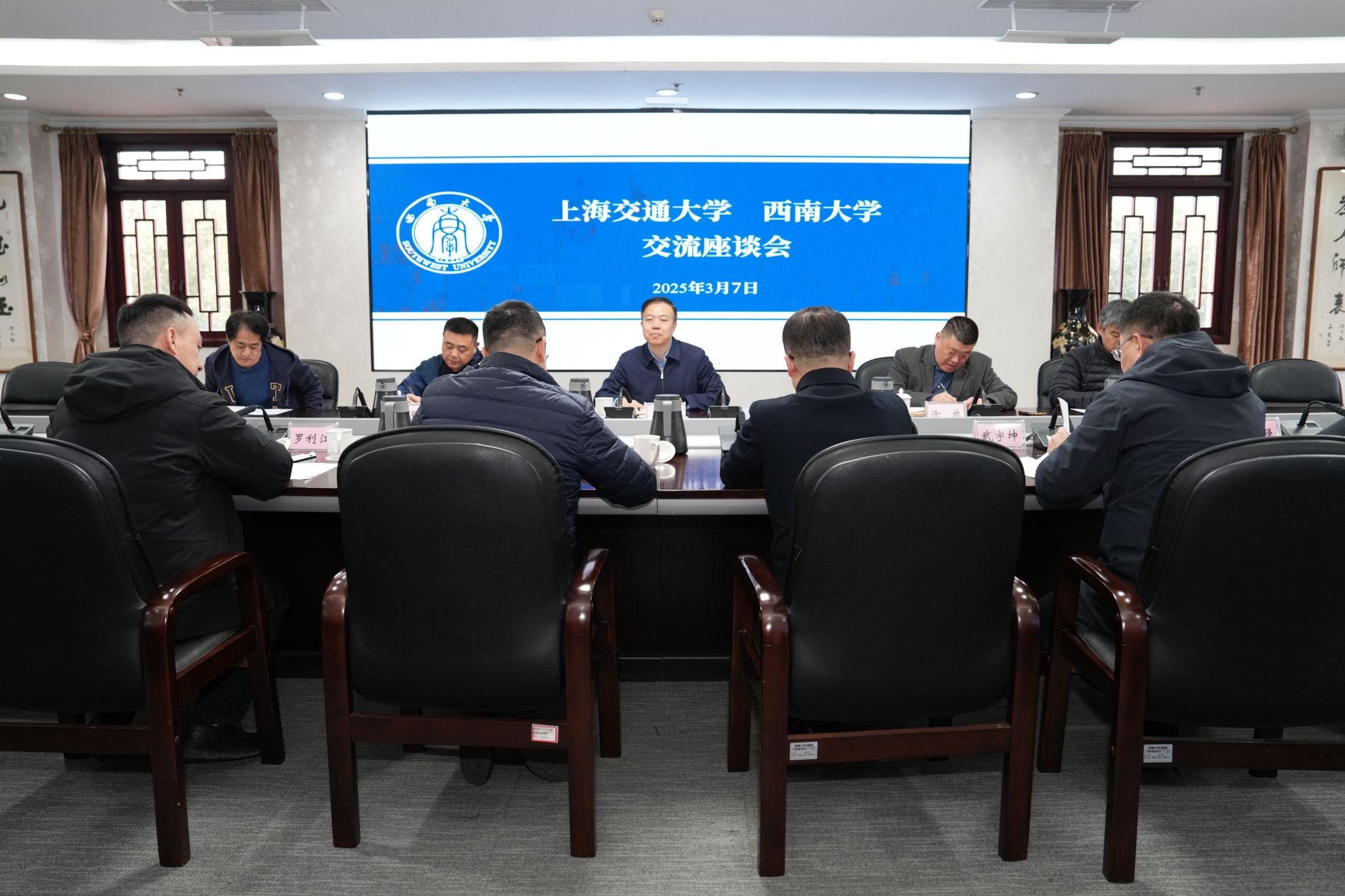 近日,上海交通大学副校长蒋兴浩一行到西南大学开展以“校园规划建设与廉政风险防控”为主题的专题调研。党委书记张卫国会见客人。双方在学校行署楼第五会议室举行座谈会,党委副书记、纪委书记嵇绍岭主持会议,原副校长(现任电子科技大学党委副书记)韩旭东及相关部门负责人出席会议。