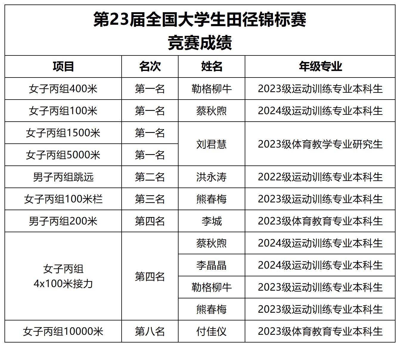 2023级体育教学专业研究生刘君慧蝉联三届女子丙组1500米、5000米双冠,2024级运动训练专业本科生蔡秋煦和2023级运动训练专业本科生勒格柳牛分别摘得女子丙组100米、400米金牌。