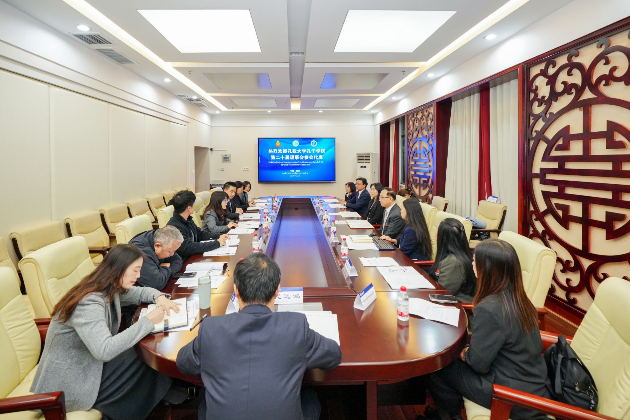 会议听取并审议了孔院中泰方院长关于2025年度工作报告、财务决算以及2026年度工作计划和预算安排。与会理事围绕“中文+职业技能”培训、本土中文教师发展、HSK考试提档升级等关键议题展开讨论,并一致表决通过相关报告。