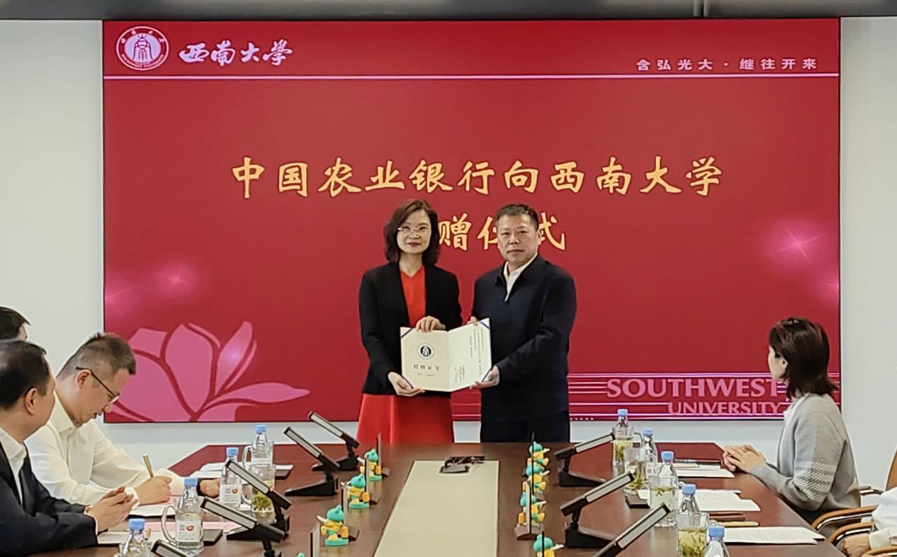 日前,中国农业银行重庆市分行向西南大学捐赠暨校友卡发卡仪式在学校举行。农业银行重庆市分行党委书记、行长朱晔,学校党委书记、教育基金会理事长张卫国;农业银行重庆市分行副行长罗波、罗永福,学校副校长邹芙都;教育基金会理事、校友企业联合会会长黎和生出席。学校党政办公室、财务部、对外联络办公室等单位负责人参加。