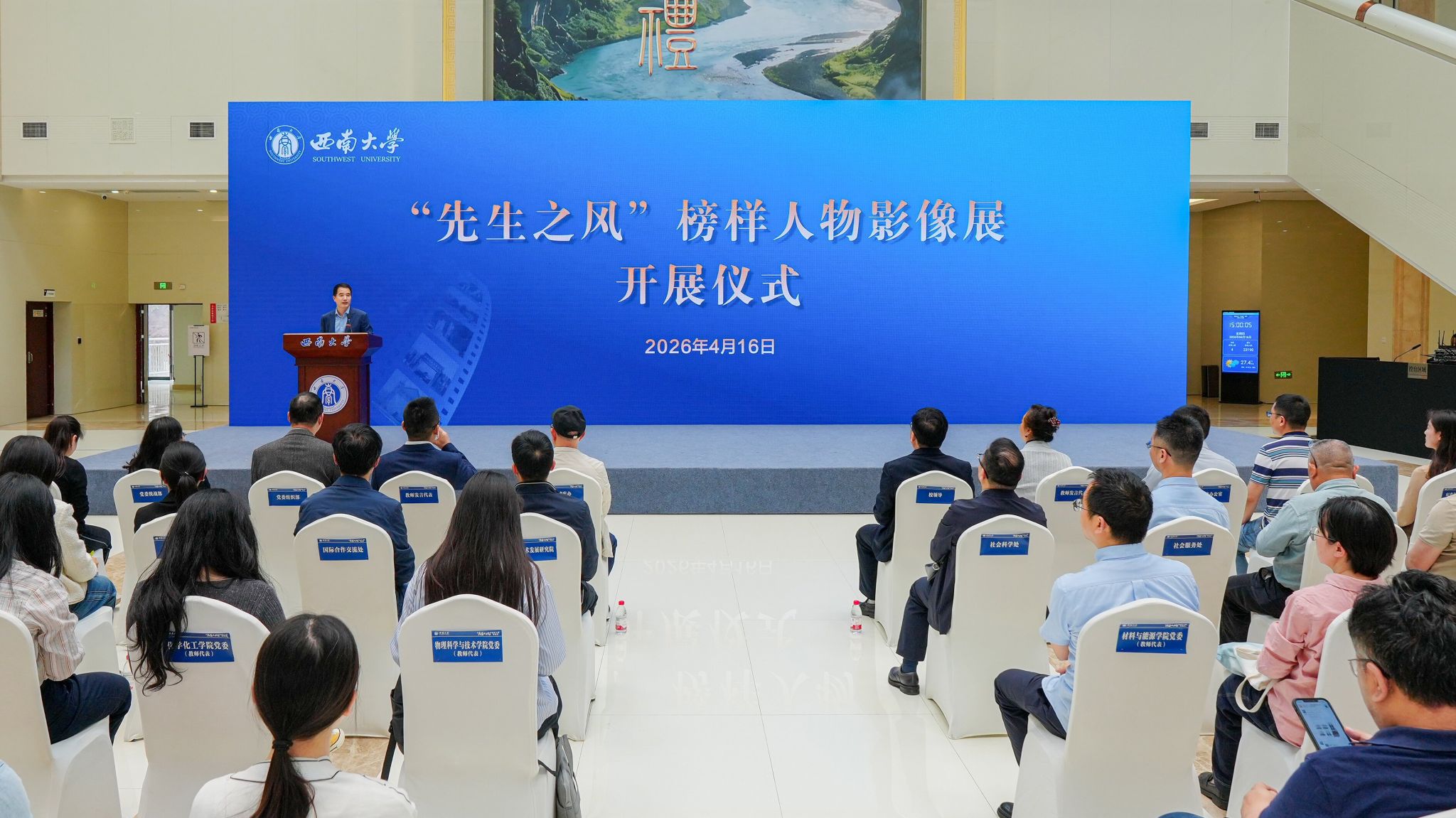 开展仪式后,与会人员参观影像展。据悉,“先生之风”榜样人物影像展以校史中的名师先贤为主线,集中展示他们的生平事迹、学术成就和精神风范,旨在引导广大师生传承西大文脉,弘扬优良教风学风,进一步激发爱校荣校、兴校强校的责任担当。