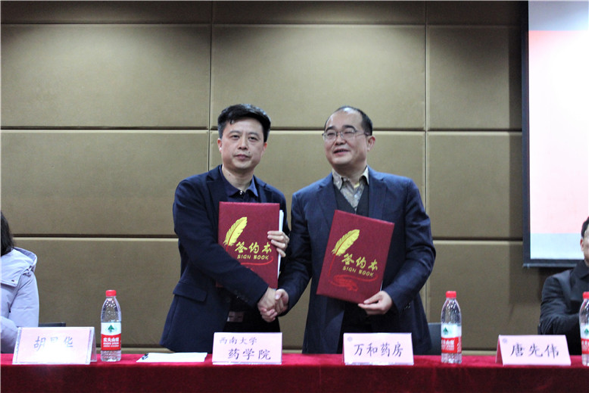 12月29日下午,药学院 中医药学院与万和药业集团战略合作签约仪式在蚕学宫举行。万和药业集团董事长唐先伟、副总裁张琳、人力资源部总监王小红,北碚区食药监分局局长张奕,西南大学学生工作部副部长高德香,药学院 中医药学院党委书记夏德全、院长胡昌华、党委副书记杨坚、副院长陈章宝、副院长陈敏、院长助理付志锋等出席签约仪式。