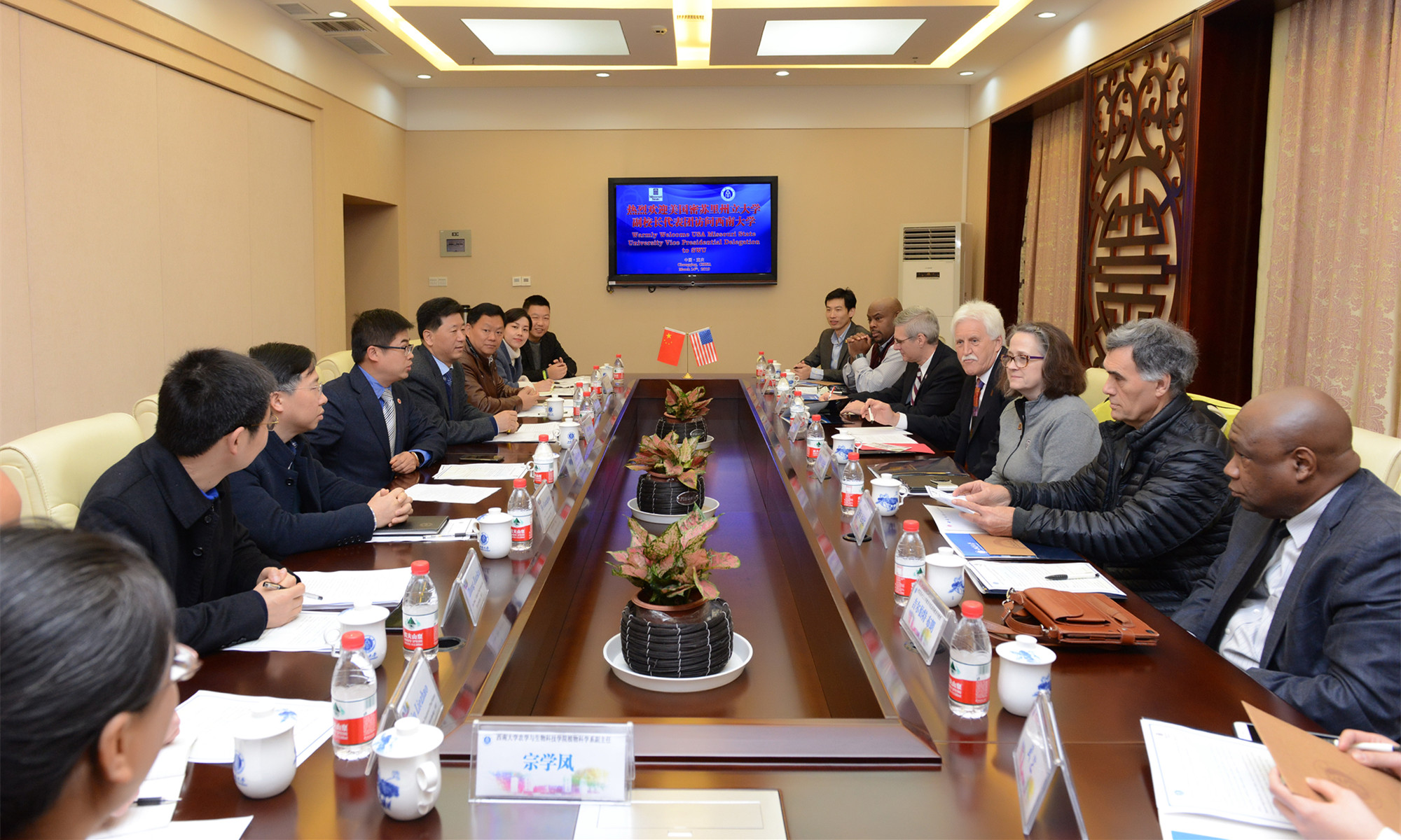 靳校长首先对贝克副校长再次率团来访学校表示欢迎。他指出,两校合作时间虽然不长,但是合作成效非常显著——在成功实施学校农学与生物科技学院、新闻传媒学院学生赴密苏里州立大学进行短期专业访学和新传学生学年访学基础上,两校联合申报的植物科学与技术专业本科中外合作办学项目获批,这标志着两校合作迈上了新台阶。靳校长谈到,这些合作成效与两校频繁互访,尤其是贝克副校长的推动密不可分,他希望通过此次访问,两校能进一步挖掘合作潜力,拓展合作领域,提升合作层次,达到合作共赢。