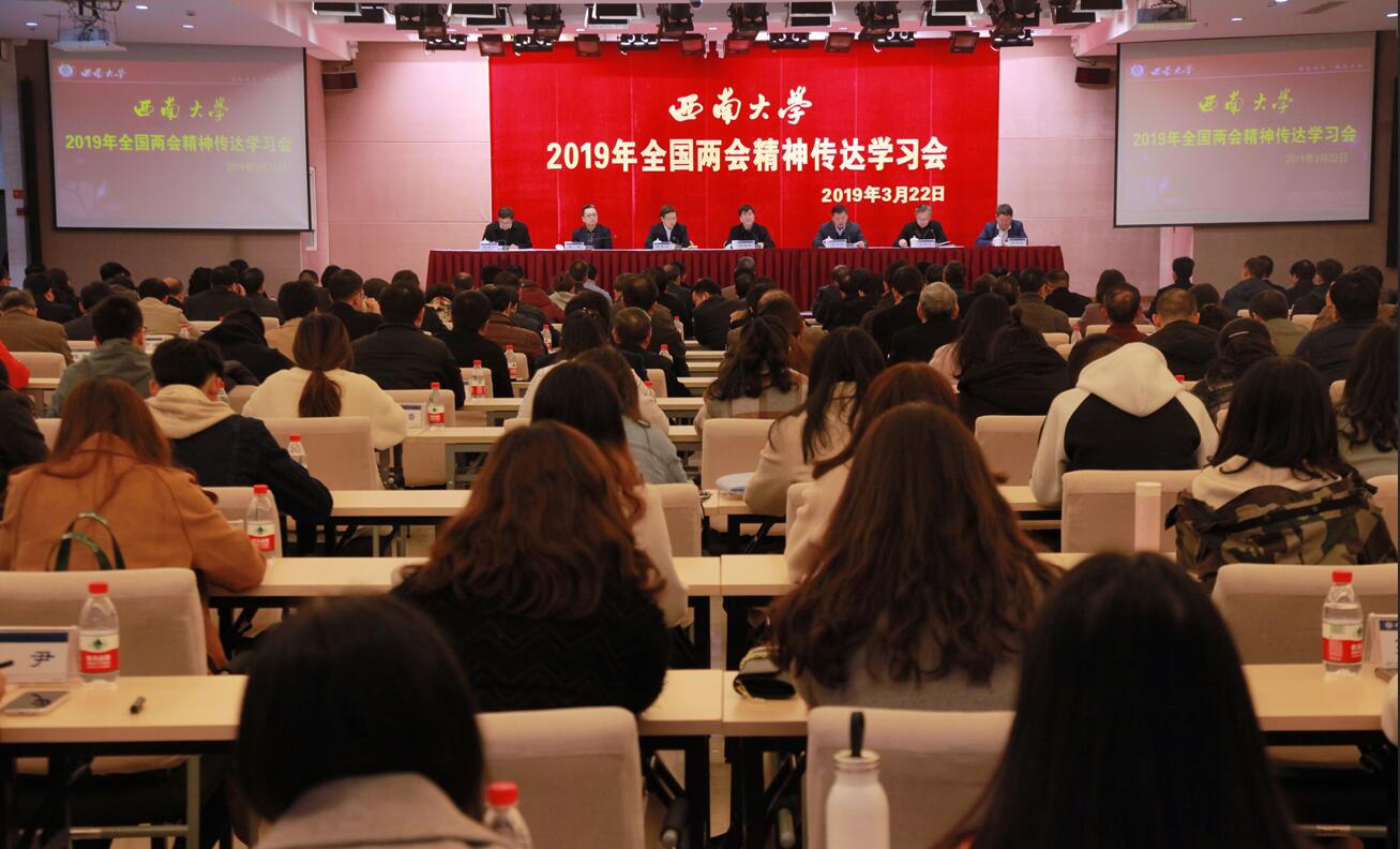 李书记要求,要在学习贯彻上做文章,筑牢西南大学的奋进之魂。学习贯彻全国两会精神,是当前学校政治生活中的一件大事。今天的会议既是传达学习会,也是工作部署会,拉开了全校学习贯彻全国两会精神的序幕。要把学习贯彻全国两会精神与习近平新时代中国特色社会主义思想和党的十九大精神相结合,与习近平总书记关于教育工作的重要论述相结合,融会贯通、一体贯彻,全方位、多层次、立体化地推进全国两会精神的学习贯彻,推动全国两会精神在西大校园落地生根。