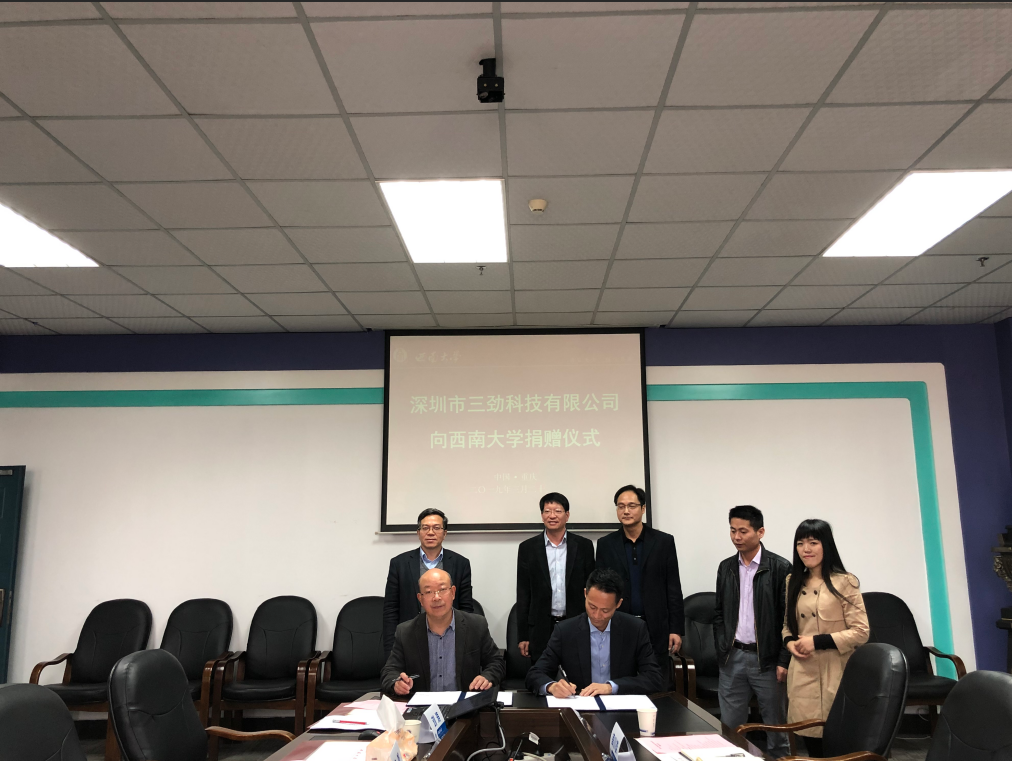 3月29日,深圳市三劲科技有限公司向西南大学捐赠签约仪式在计算机与信息科学学院 软件学院举行。参加签约仪式的有深圳市三劲科技有限公司创始人兼CEO、学校外国语学院87级校友李庆康,深圳市三劲科技有限公司研发副总裁周小雄,测试经理龚燕英,学校对外联络部部长、教育基金会秘书长龚常智,副部长刘涛,外国语学院党委书记文旭,计算机与信息科学学院 软件学院院长肖国强、张自力教授等。仪式由刘涛副部长主持。