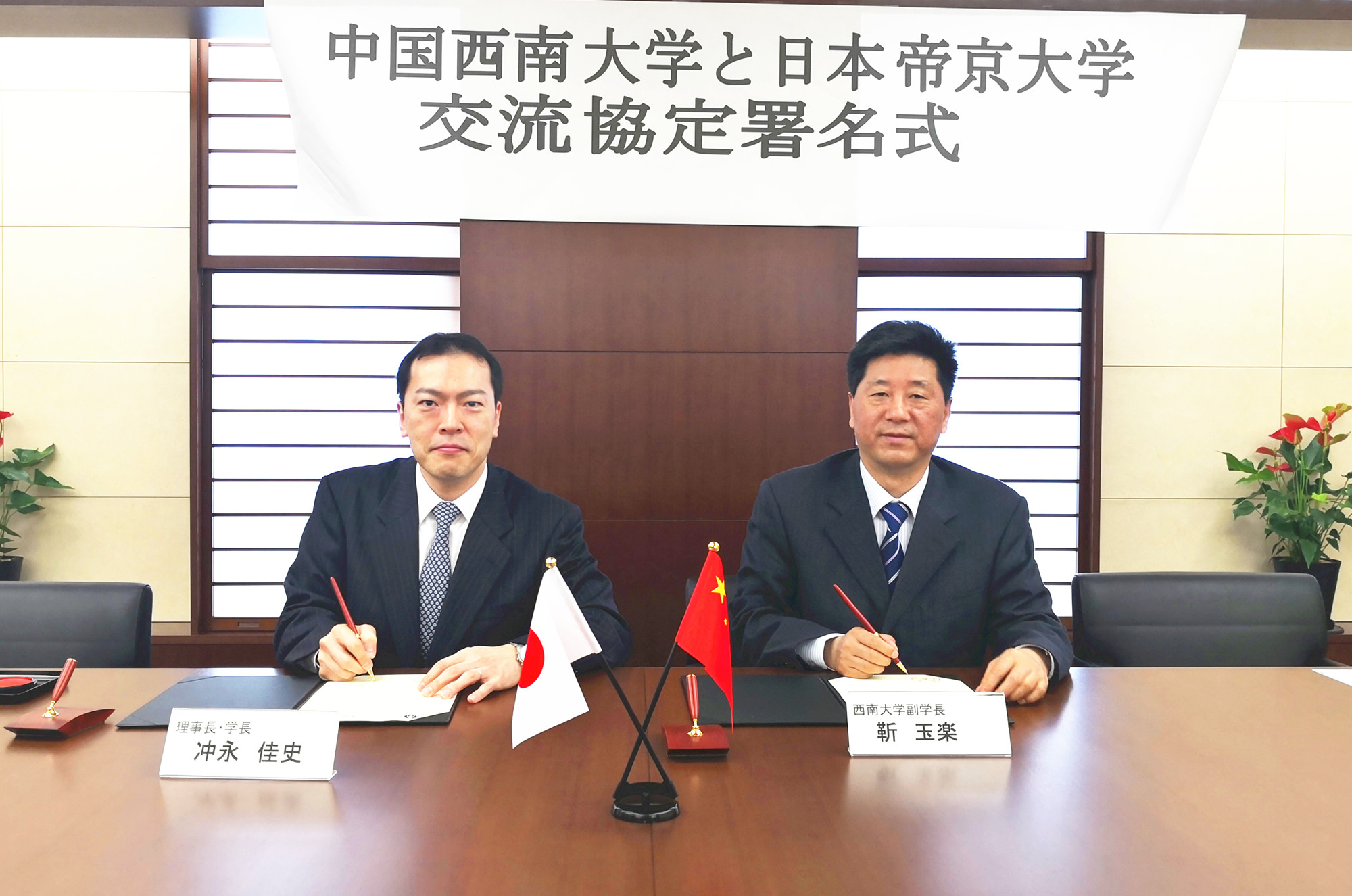 3月29日至30日,代表团访问日本帝京大学,与该校校长冲永佳史、理工学研究生院院长作田庄平教授、药学院院长栗原顺一教授、校办主任利根川丰等会谈。校长冲永佳史表示帝京大学将全力以赴与西南大学开展广泛的国际交流与合作。靳校长代表学校邀请冲永校长访问学校,期待两校今后在生物科学等领域开展强强合作,进一步推动师生交流、合作科研、联合建立实验室等项目。随后,双方签订了校际合作协议,代表团还参观访问了该校药学院、理工学院等校区。