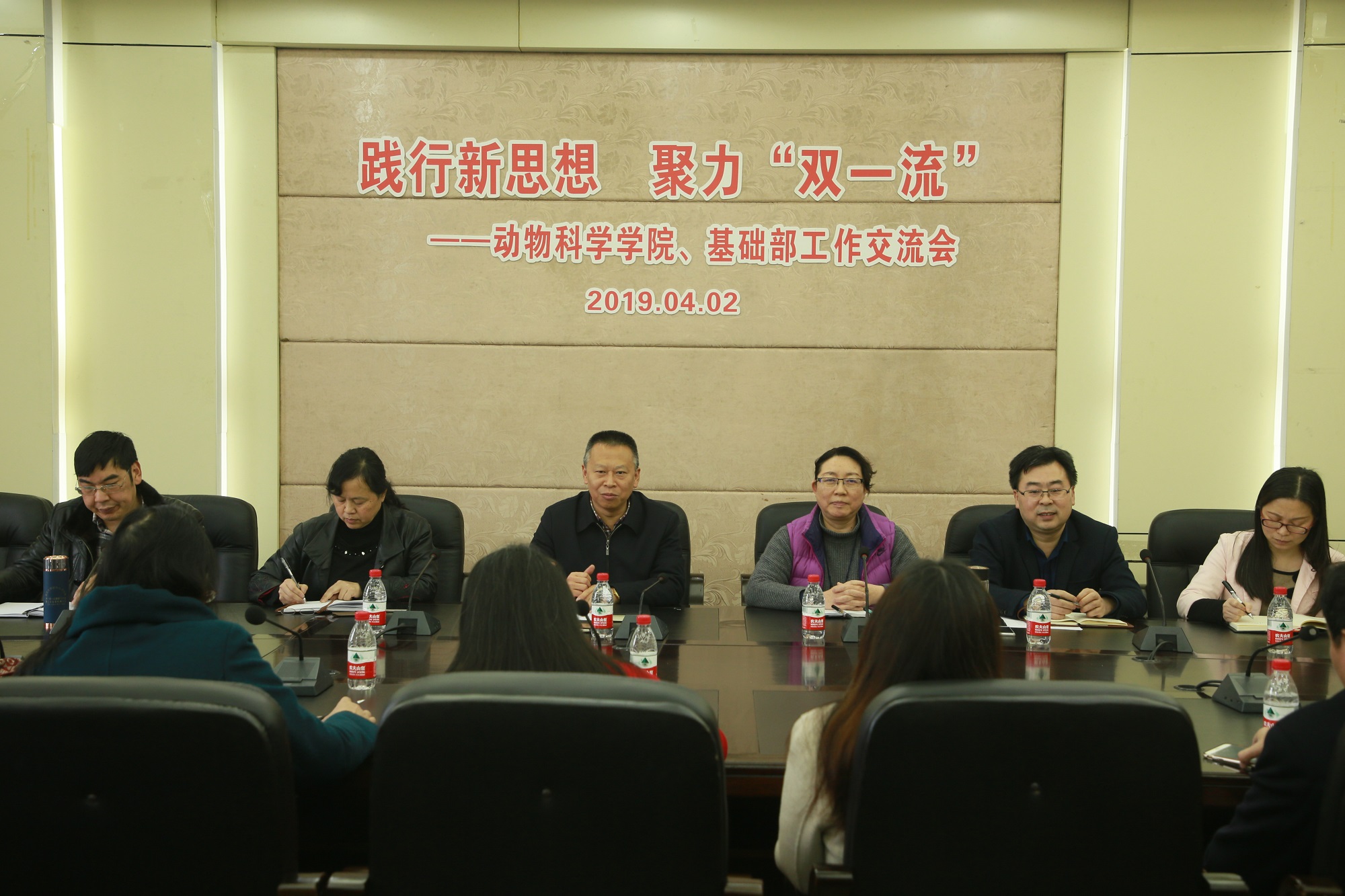 朱汉春书记就抓党建、带班子、促改革、强服务、推进“双一流”建设提供坚强保障方面作了发言。朱书记指出,要引导广大青年坚定听党话跟党走,进一步强化“全党抓思想政治引领”的工作理念,用习近平新时代中国特色社会主义思想武装头脑,指导实践,推动工作。基础部党总支书记童学兰指出,要以思想政治引领为首要任务,把思想政治引领贯穿党的各项工作全过程,不断增进对党的信念、信心,高扬“不忘初心紧跟党走”的主旋律。动物科学学院刘娟院长、基础部魏东主任分别介绍了本单位基本情况,与会人员围绕人才培养、课程思政建设实施、学科队伍建设、科学研究等进行了深入交流,达成共识。