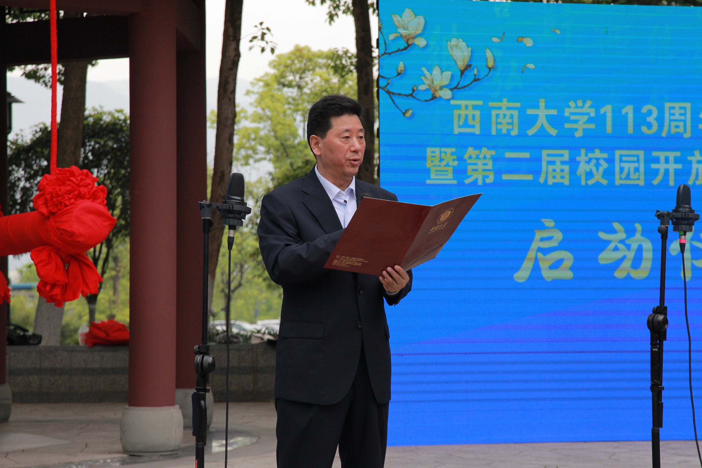 西南大学副校长靳玉乐主持启动仪式。靳校长介绍,此次活动旨在敞开怀抱,向新老朋友充分展示西南大学在办学条件、学科特色、师资力量、人才培养等方面的发展成就,弘扬西南大学“含弘光大,继往开来”之校训、“特立西南,学行天下”之大学精神,晒出西南大学这所百年学府传统悠久的历史文化和风光旖旎的校园春景。