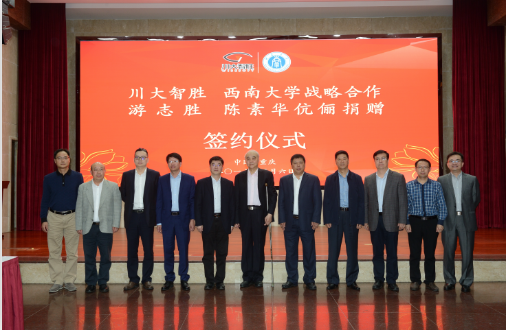 5月6日下午,四川川大智胜软件股份有限公司(以下简称川大智胜)与西南大学战略合作签约仪式以及游志胜、陈素华伉俪向西南大学捐赠仪式在东方红会议厅举行。参加签约仪式的有川大智胜董事长游志胜,总经理张自力,三维大数据产业研究院专家团队以及川大北碚校友会会长周洪琴,学校党委书记李旭锋,校长张卫国,副校长靳玉乐、温涛,以及党委办公室、校长办公室等相关职能部门和学院的主要负责人、师生代表。仪式由副校长王进军主持。