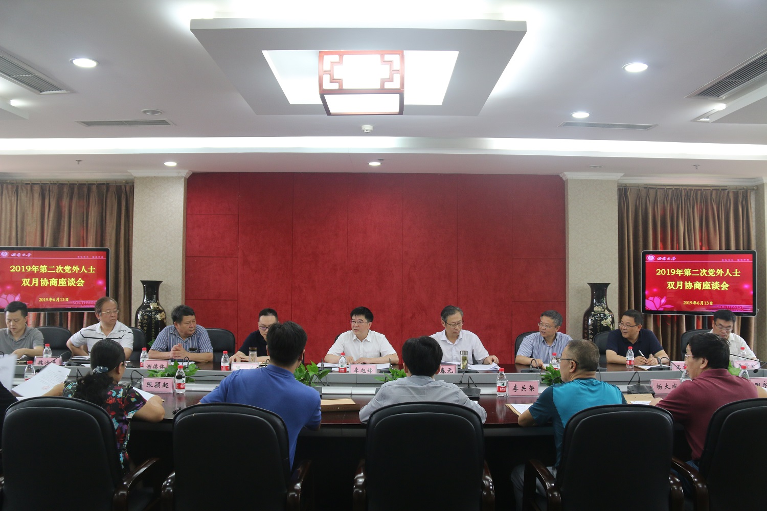 6月13日下午,学校党委在行署楼5会议室举行党外人士双月协商座谈会,专题协商学校第三次党代会工作报告。学校党委书记李旭锋主持会议,党委副书记安春元、副校长温涛出席,全国人大代表、全国政协委员,各民主党派学校、区、市级组织主副委,统战团体负责人,统战部负责人参加会议。
