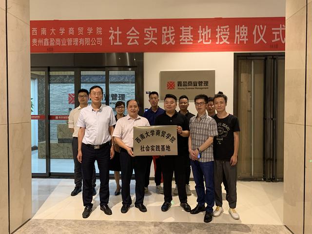 7月19日下午,商贸学院与贵州鑫盈商业管理有限公司签订落成“西南大学商贸学院社会实践基地”,并举行揭牌仪式。商贸学院党委书记周国安、院长熊海灵、办公室主任黄维兵、贵州鑫盈商业管理有限公司董事长、商贸学院学院校友侯郑伟及公司相关部门负责人出席仪式。