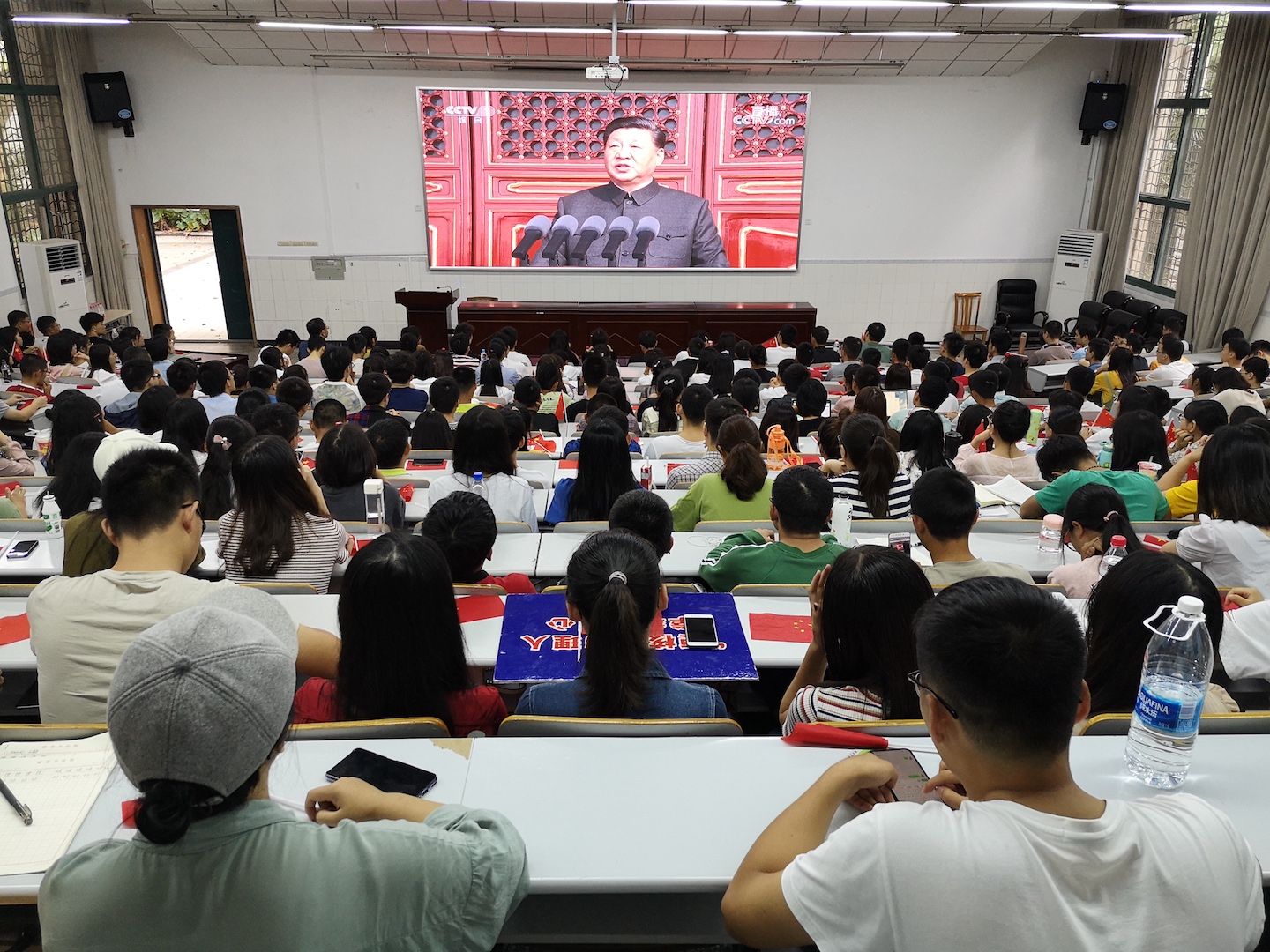 全体校领导、党委常委、校长助理、党委委员、纪委委员在东方红报告厅集中收看,辅导员代表和学生代表在学生处106室集中收看。各二级党组织召集本单位师生共同收看庆祝大会盛况。广大师生怀着激动的心情,一起聆听了中共中央总书记、国家主席、中央军委主席习近平的重要讲话,观看了盛大的阅兵式和群众游行,深受鼓舞、倍感振奋。直播盛况引起学校师生强烈反响。