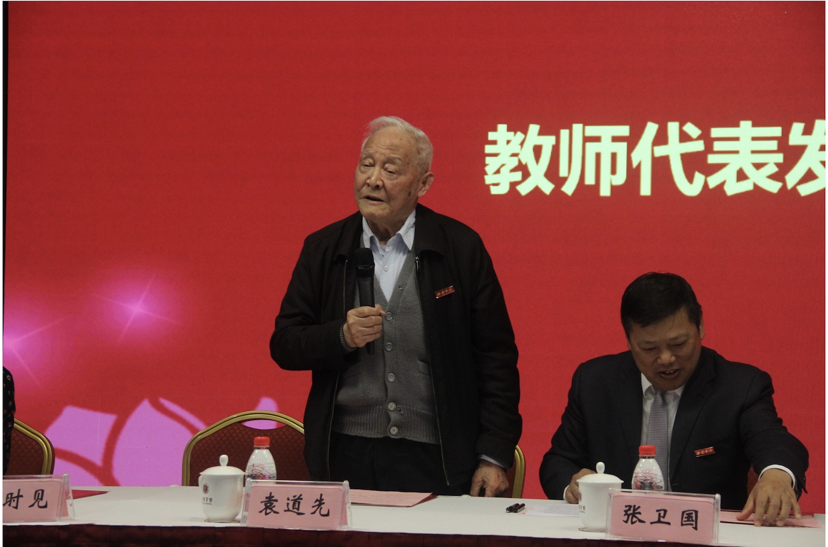 在学校教师代表发言环节,向仲怀院士提出做大学教师要志成高远、淡泊名利,弘扬科学精神、提高自我修养,坚守岗位、无私奉献,努力成长为学校和国家的栋梁之才。袁道先院士嘱托新进教师要把个人的奋斗与学校的发展紧密相连,为西南大学做贡献,为西南大学而骄傲。黄希庭教授告诫新进教师们教好书,好教书,将教学和科研结合在一起,同时积极锻炼身体,经营好自己的生活。赵伶俐教授寄语大学教师不断提升自己的教学水平和学术能力,追求高校教师之高,大学教师之大。