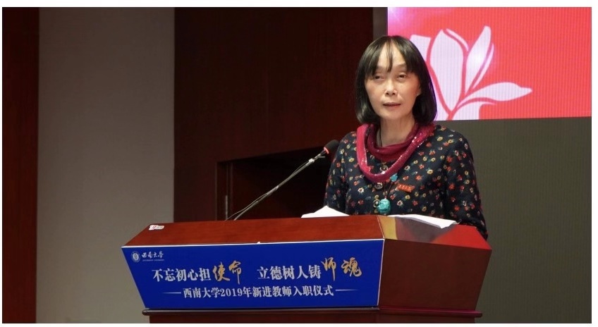 董小玉教授领誓,180余名新进教师进行了庄重的入职宣誓,用铿锵有力的声音作出了对投身西南大学教育事业的郑重承诺。